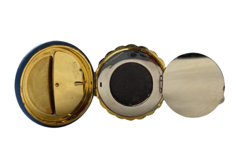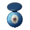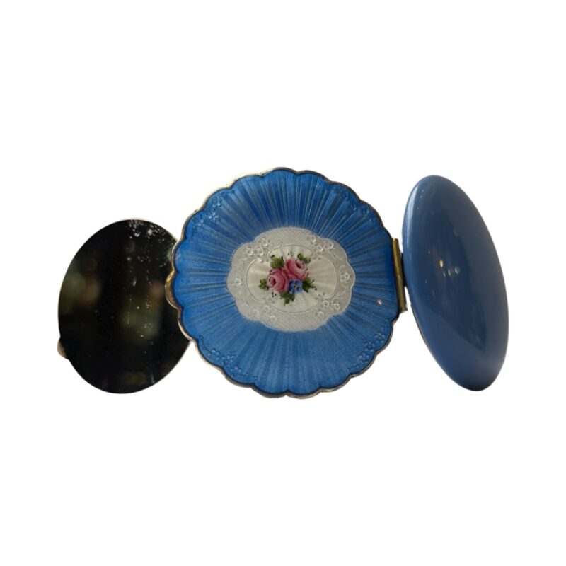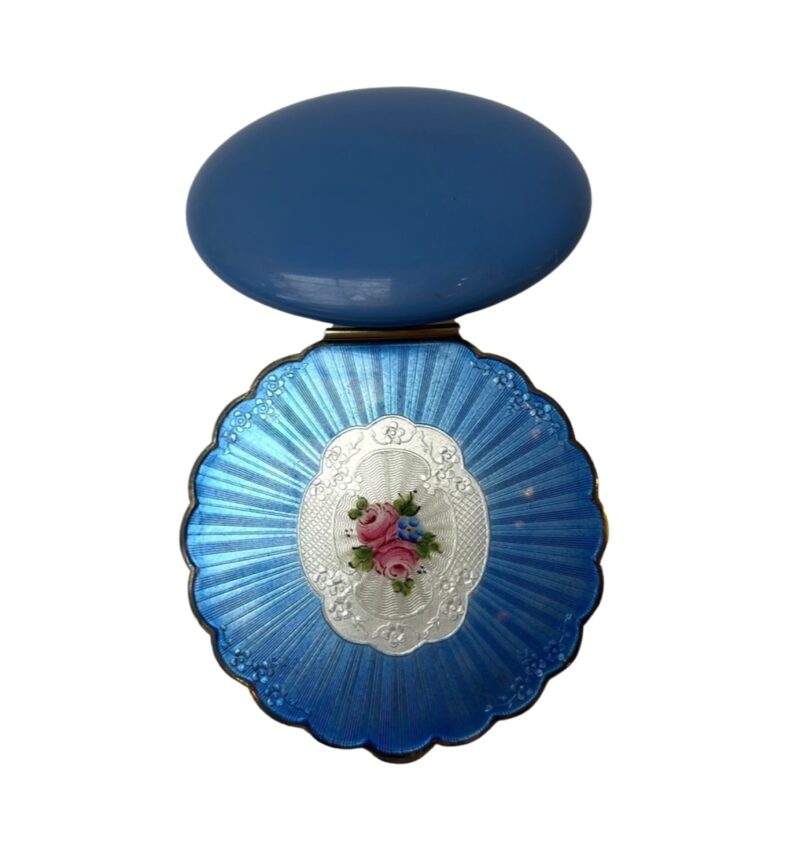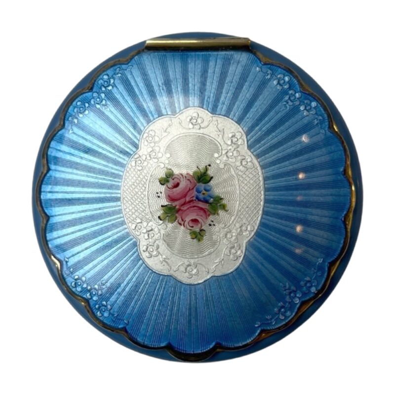 Guilloché Blue Enamelled Round Makeup Compact with Centre Hand Painted Roses.