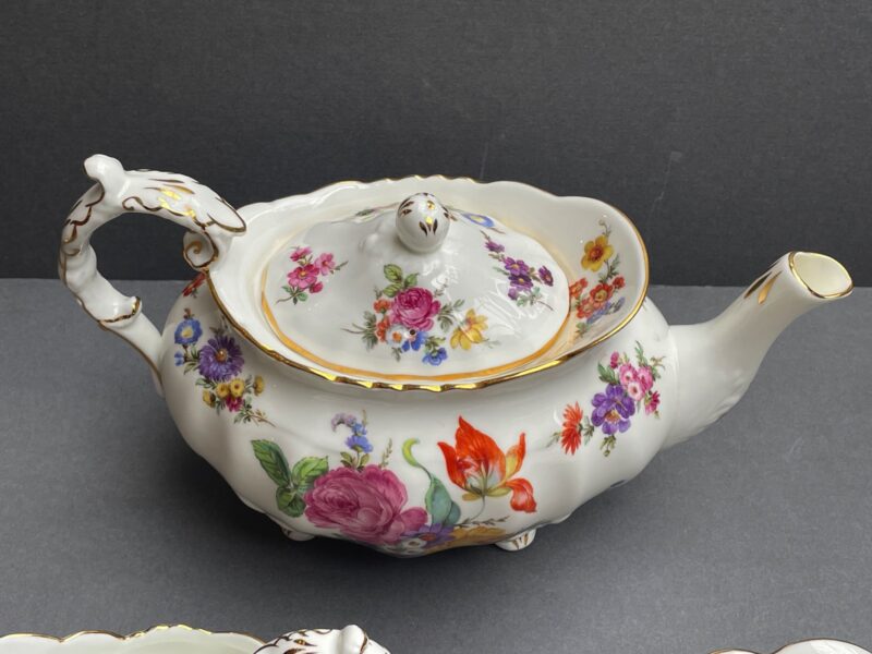 A beautifully painted tea set by Hammersley.  A floral spray pattern – with florals painted all the over bodies of all three pieces.