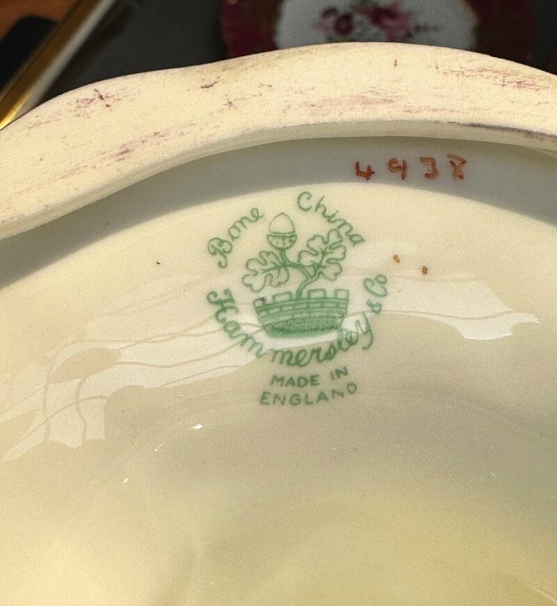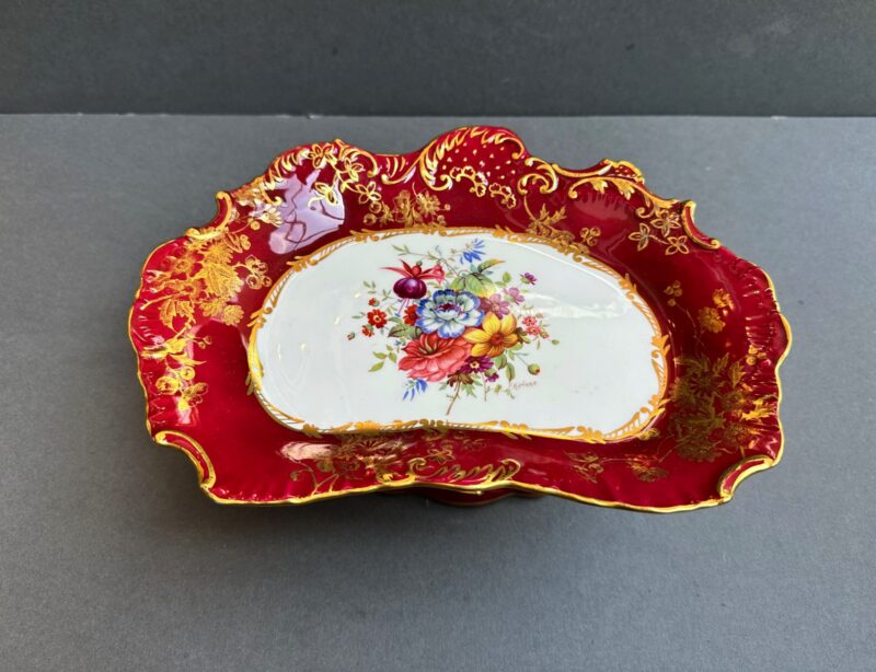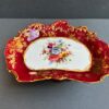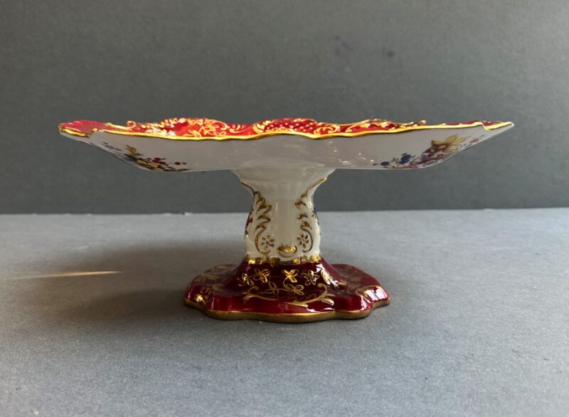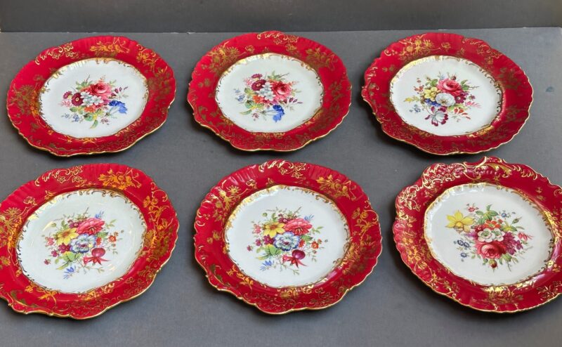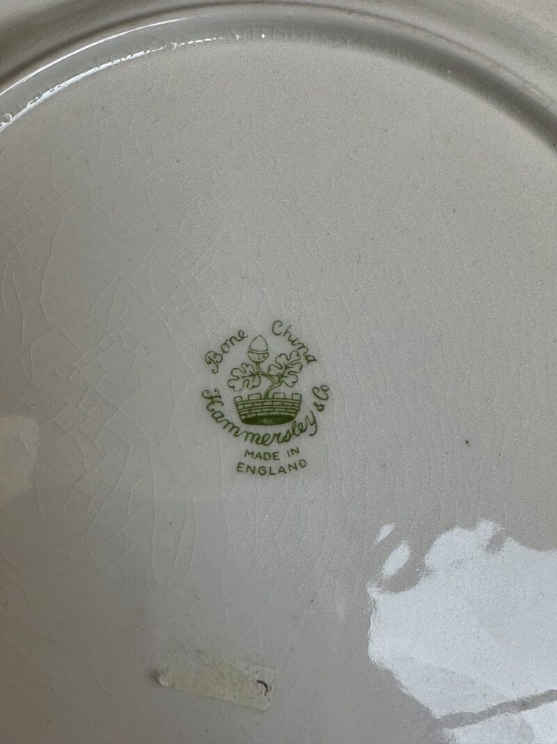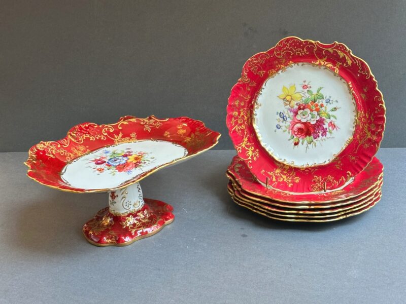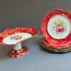 v** SOLD ARCHIVES **vThis lovely hammersy dessert set comes with 6 plates, and one pedestal compote, The set has a stunning shade of red rim, and a contrasting white centre. Every plate, as well as the compote, features a different setting of flowers to differentiate themselves. Hammersly originates in England, and was founded by John and William Hammersly. Hammersly & Co. was renowned for their floral motifs, hand-painted designs, and their exquisite craftsmanship.