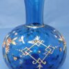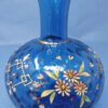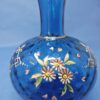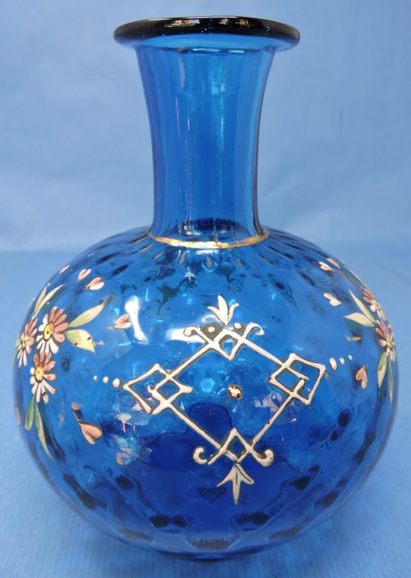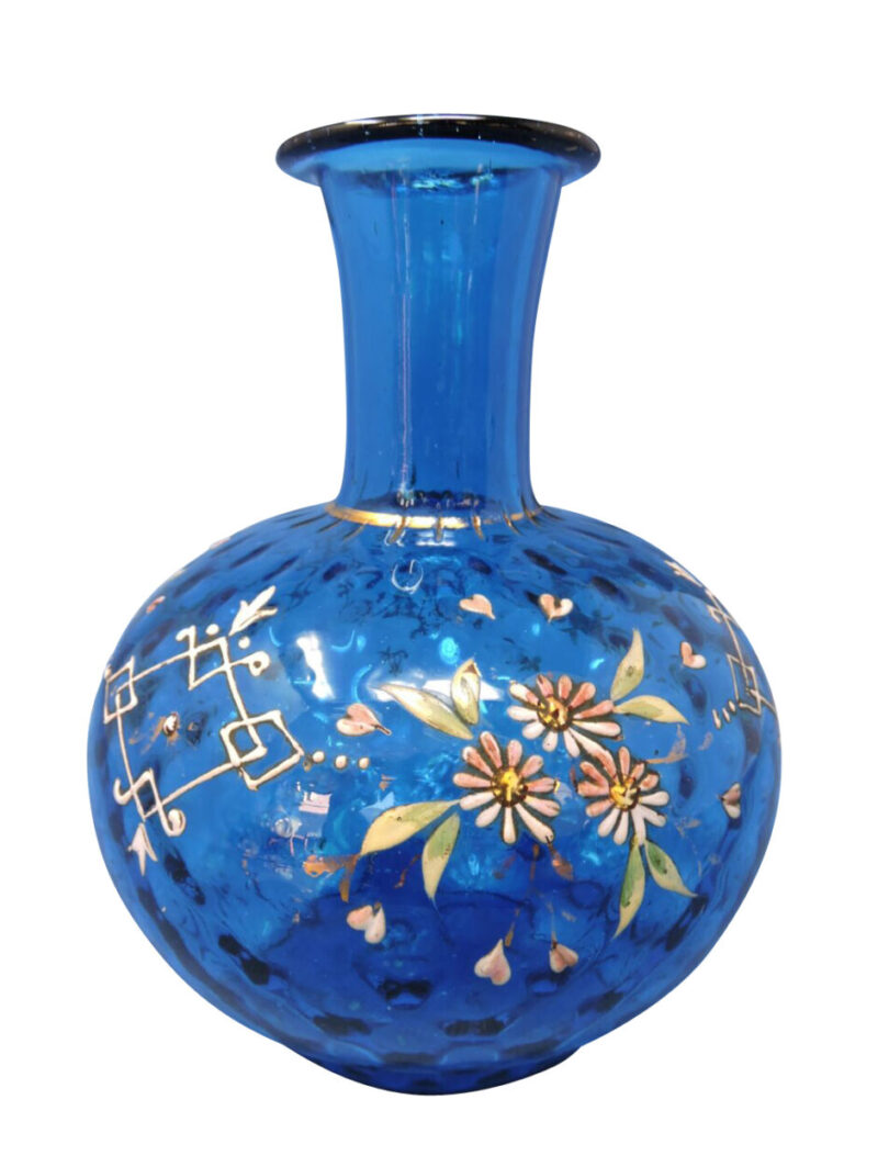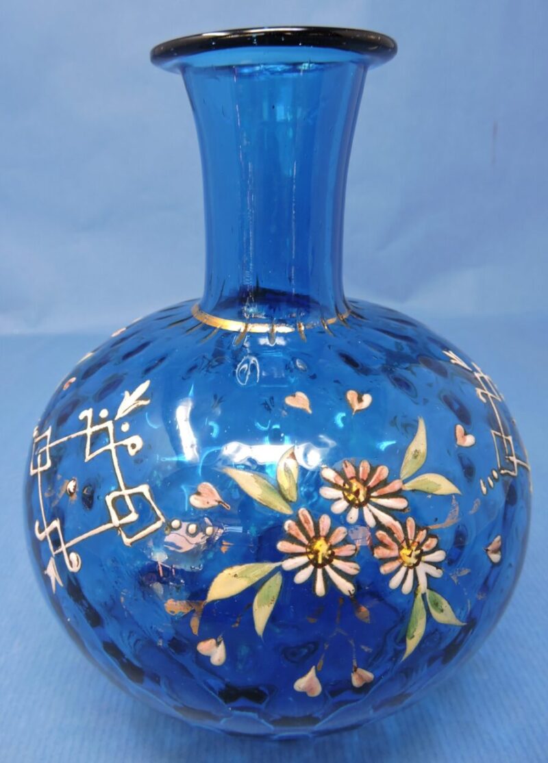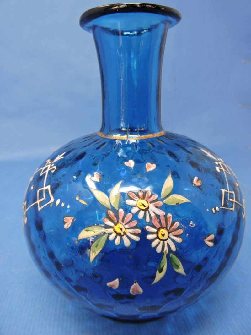 A beautiful hand-blown blue coin dot glass vase, decorated with enamelled daisies and leaves and showing enamel hearts interspersed around the flowers. There is a gold line separating the neck and the body of the vase.