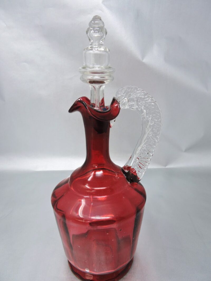 Hand-Blown Cranberry Glass Decanter with Clear Glass Stopper and Decorative Applied Handle, c. 1890