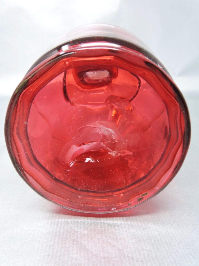 A lovely hand-blown cranberry glass decanter with a removable clear glass stopper and a decorative, applied clear glass handle, circa 1890. There is a large pontil on the underside of the decanter showing where it was detached from the glass-blowing apparatus.