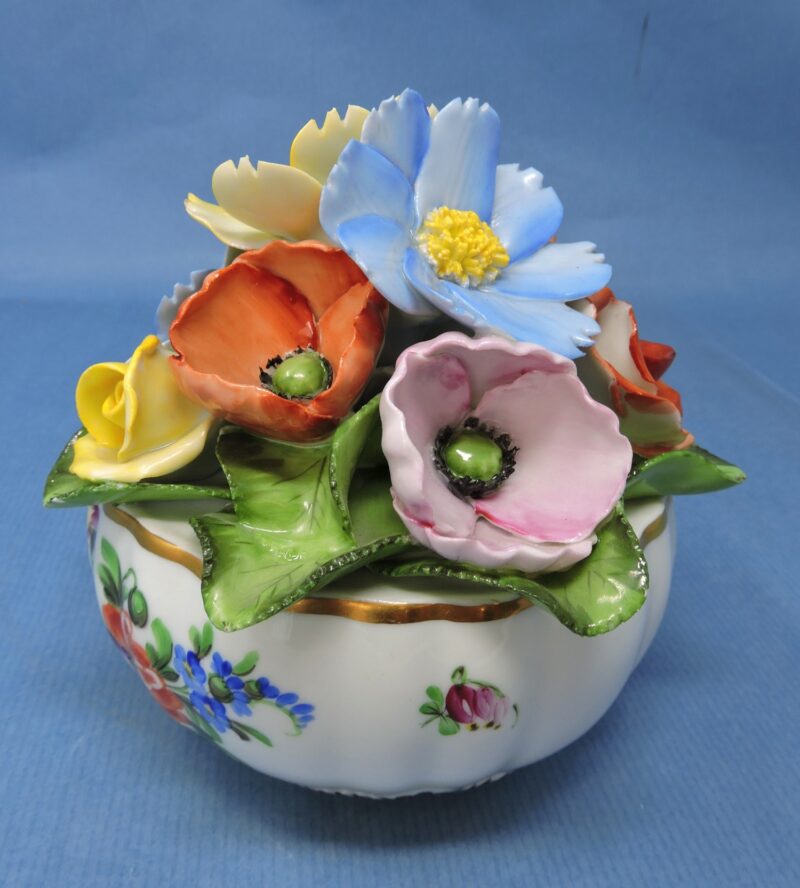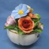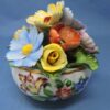 The bowl has a white background with a gold trim around the scalloped rim and base and is painted with multi-colour florals around the body of the bowl. Inside the bowl and attached with a porcelain base is a bouquet of colourful applied flowers.