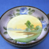 The interior of the dish has been painted with a centre pastoral scene, surrounded by large blue cabbage roses and green leaves on a mauve background.