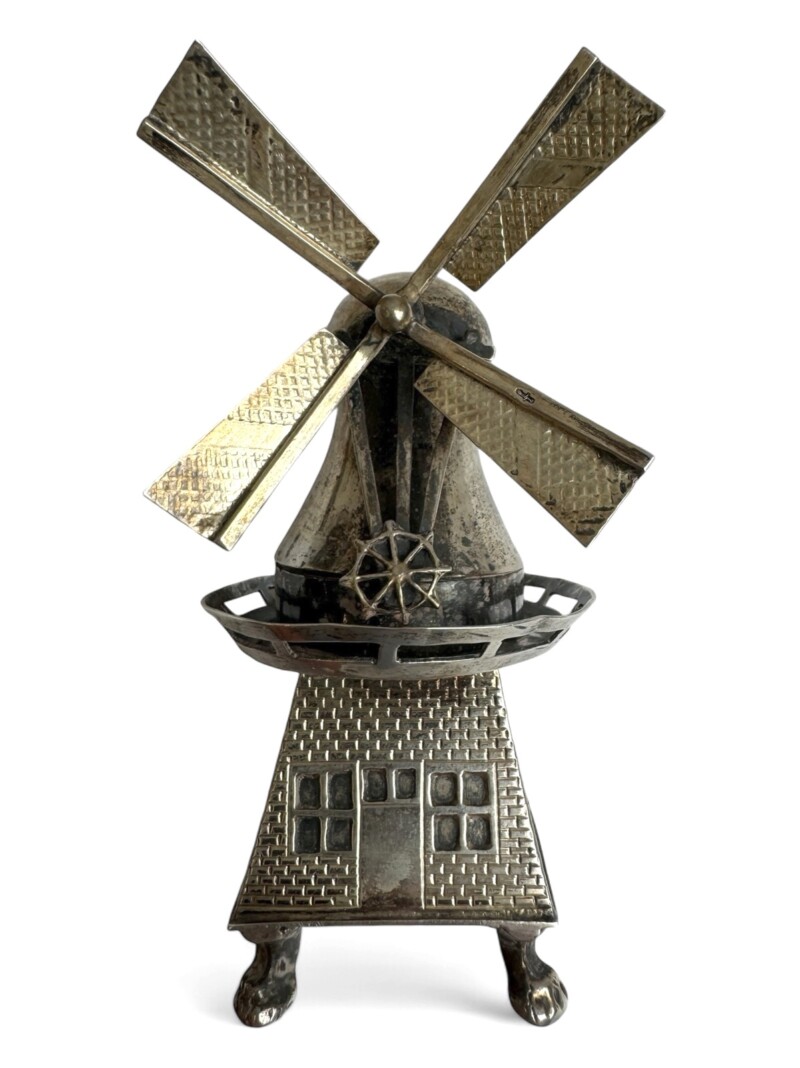 Gift Ideas, Silver HollowareVery animated Dutch handcrafted miniature windmill sculpture in .833 silver. Features a Dutch style windmill with moving windmill blades and an adorable brick building mounted atop 4 clawed feet.