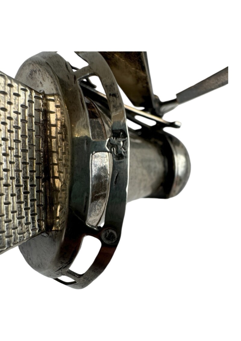 Hallmarking and date marking of silver are longstanding traditions in the Netherlands with the standardization system, put into practice in 1814, which remains largely unchanged today. The 3 separate Dutch silver marks are found on different parts of the windmill: the Lion Rampart mark and “S” mark are on the underside of the windmill “tower deck” denoting .833 purity and made in 1902 respectively, while the “sword” mark is on the underside of the windmill blade, denoting interconnected separate parts of .833 purity.
