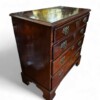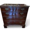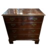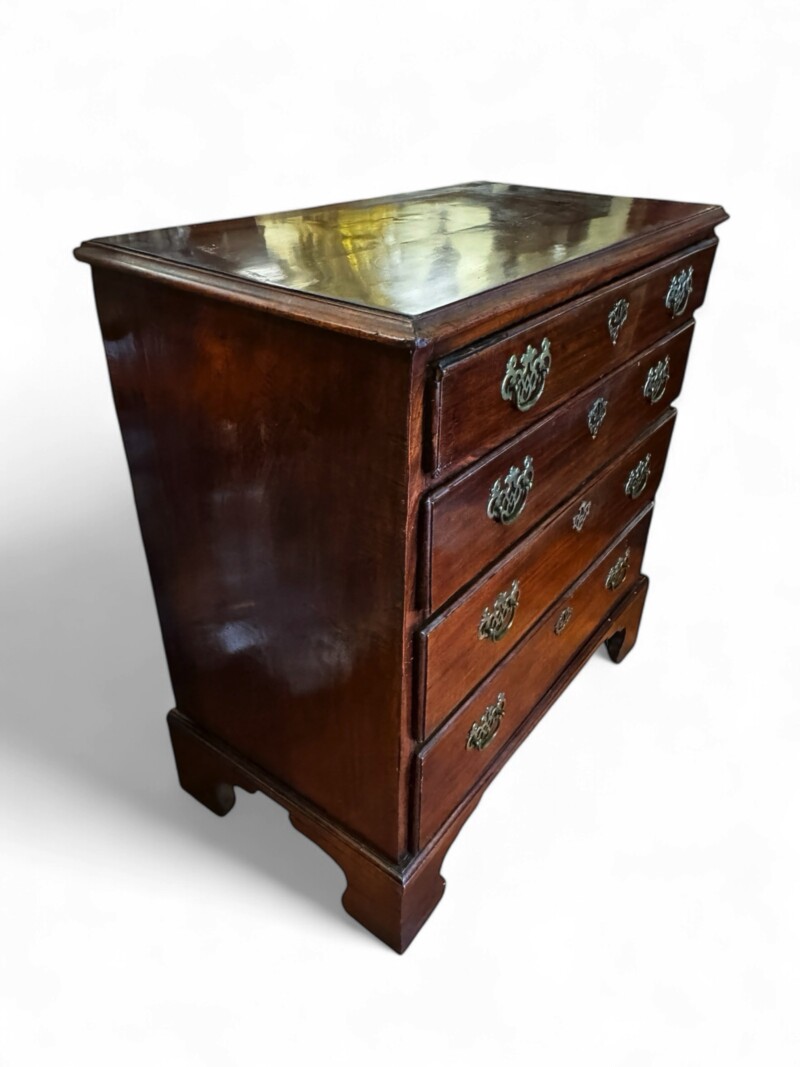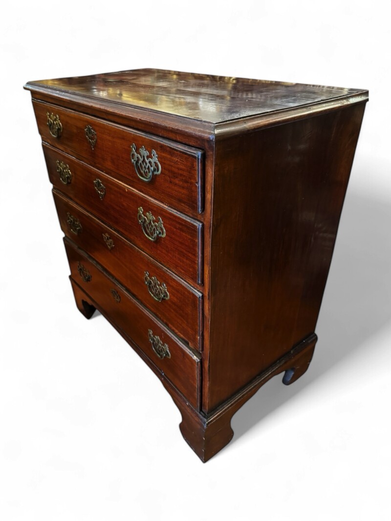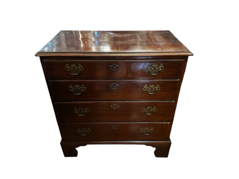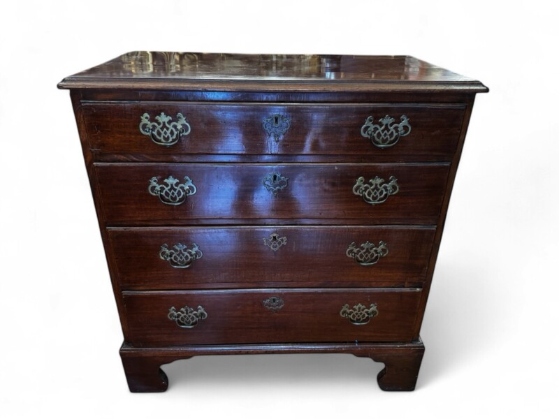 A handsome, small-scale George II chest of drawers, originally intended for a “bachelor gentleman” . Dating circa 1750  and comprised of four long, full width, graduating drawers with the shallowest to the top and the deepest to the bottom. Gorgeous brass pull handles and lock escutcheons. Standing on bracket feet.