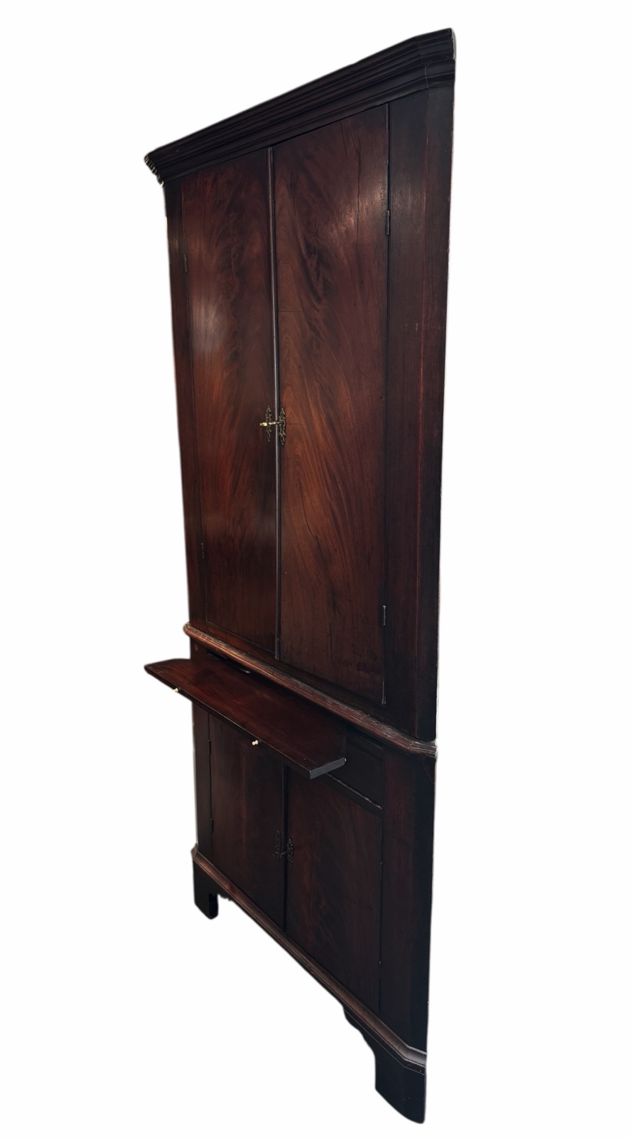 A handsome and very tall 86.5″ George III corner cabinet with gorgeous symmetrical “flame ” mahogany panel doors in two storage sections top and bottom for ease of moving.  The top section is taller with 3 interior Georgian era triangular shaped shelves. The pair of mahogany doors are lockable with a brass lock and escutcheon. The bottom section storage features a small shelf with ivory handles, a full width triangular drawer with brass oval pulls/ “lion head” medallions and a lower storage of two shelves with flame mahogany panel doors,  all supported on bracket feet.