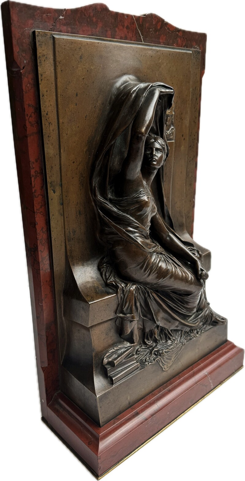 Henri Chapu Parisian Sculptor’s Bronze Plaque “La Pensée” Mounted on Rouge Marble