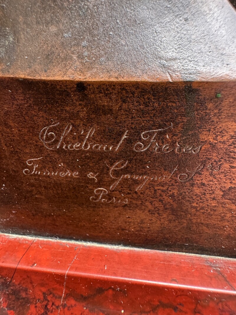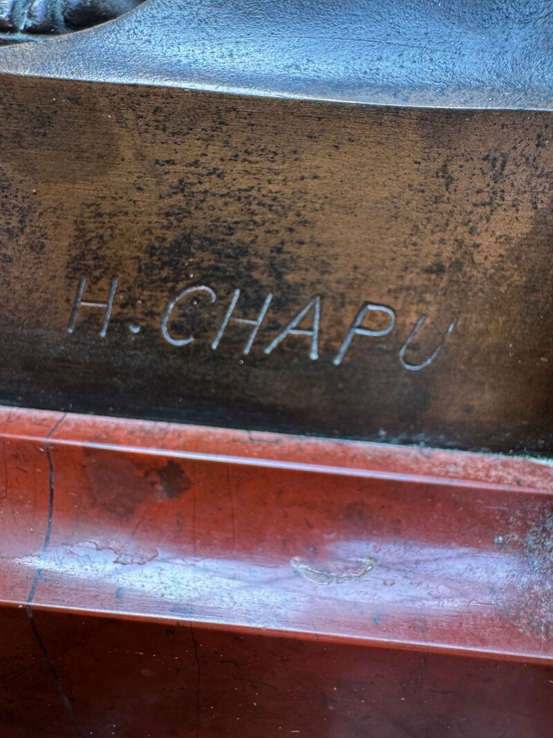 Henri-Michel-Antoine Chapu (French, 1833-1891) bronze plaque mounted to rouge marble. Titled ‘La Pensee’. Signed H. Chapu and holds the Thiebaut Freres Fondeurs foundry mark. High-relief bronze “La Pensée”, signed by the French sculptor Henri Chapu, a prolific and recognized artist under the Second Empire. His works were notably published by the largest foundries of the time, such as that of the Thiébaut Frères, whose stamp adorns the left side.