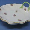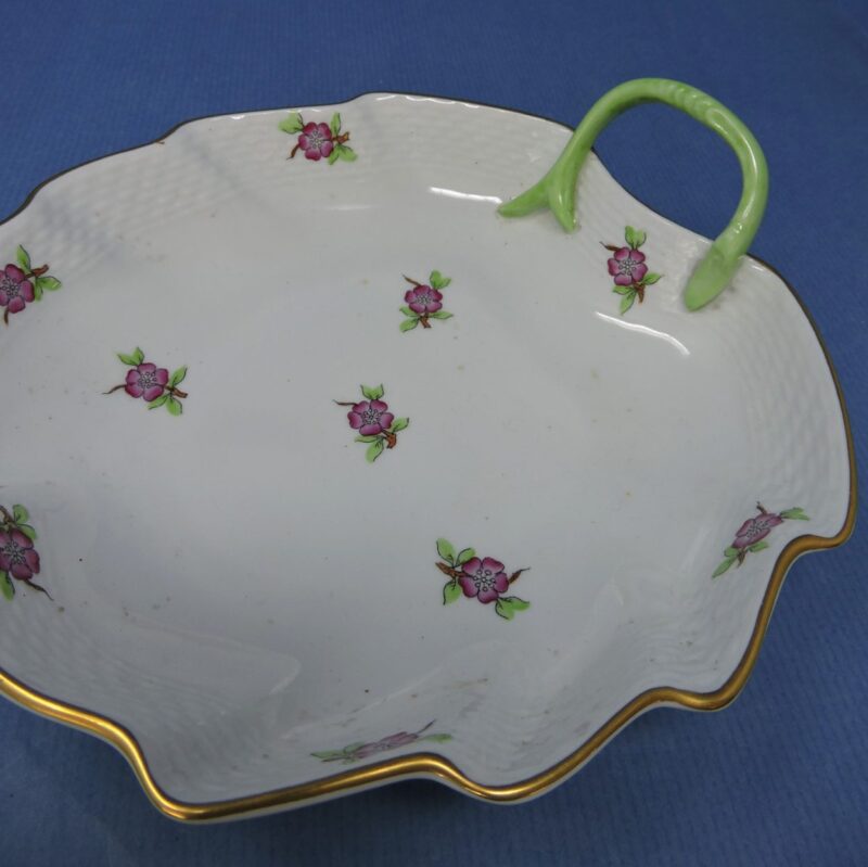 v** SOLD ARCHIVES **vA lovely Herend Hungary hand-painted porcelain leaf shaped dish with a scalloped rim trimmed in gold, a handle, and decorated with tiny floral decorations all over the interior of the bowl.