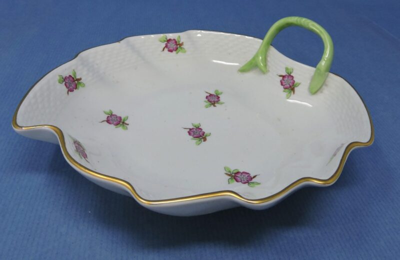 Herend Hungary Hand-Painted Porcelain Leaf Shaped Dish, Decorated with Small Pink Flowers and Leaves