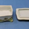 The edges of the feet and lid of the box are painted in pale green with gold edging and there is a gold rim around the lid and just below the rim of the box.