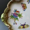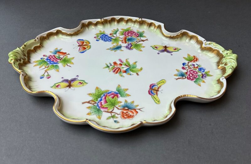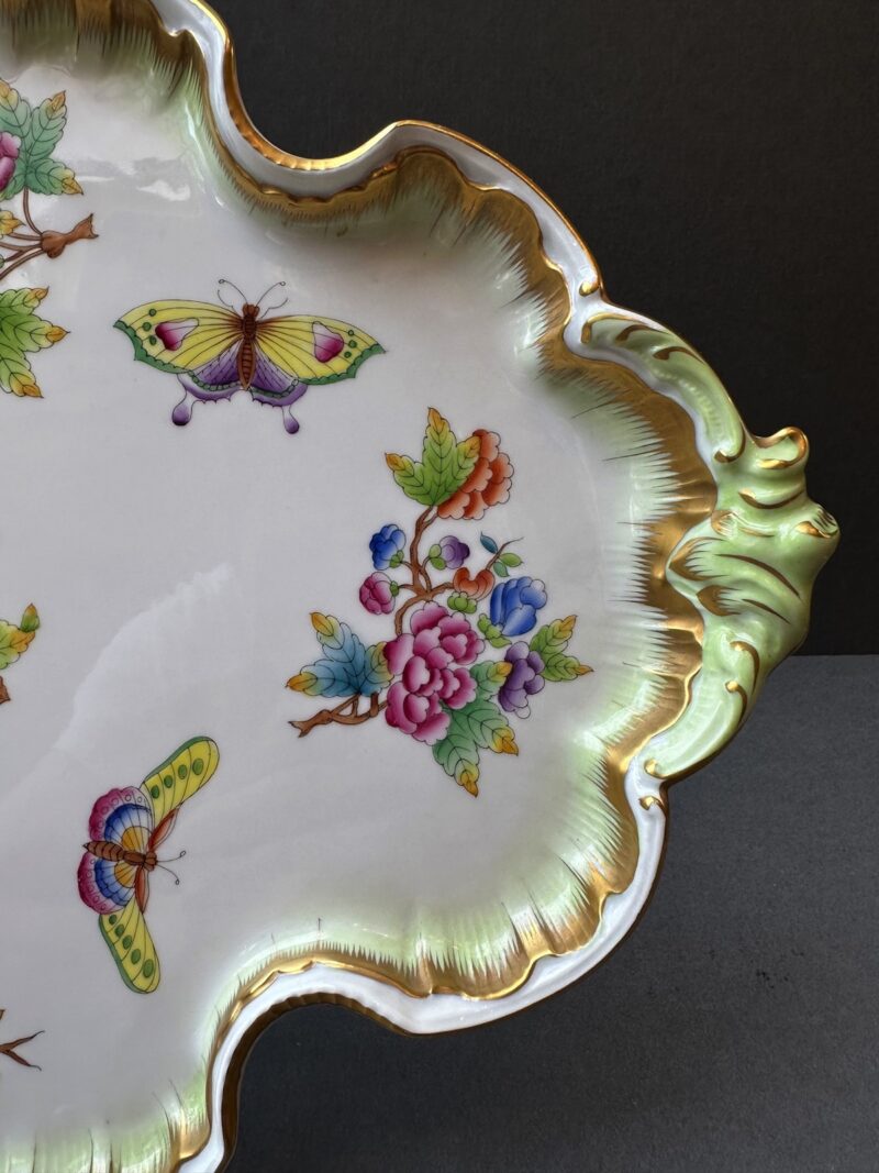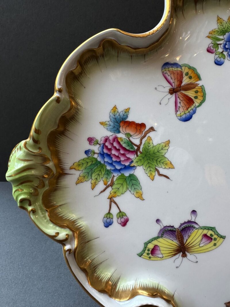 A lovely Rococo shaped porcelain tray in the Victoria pattern by Herend.  Florals and butterflies with green trim and gold highlights.  This piece retails in the Herend Museum collection for over $1500.00.
