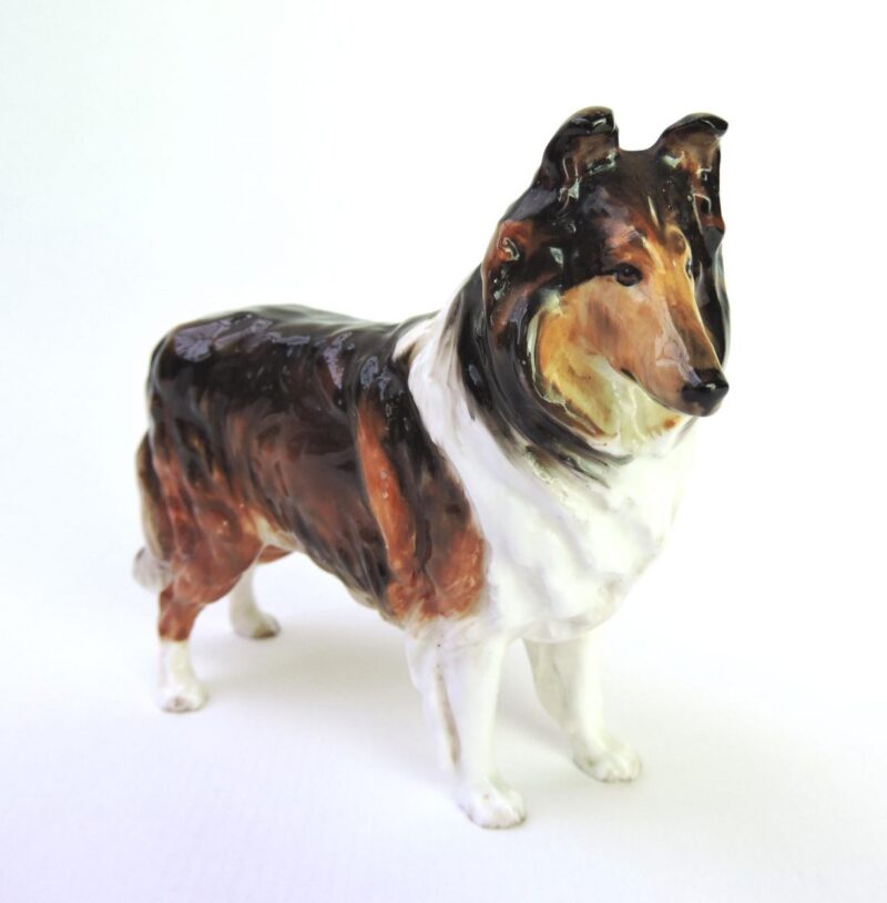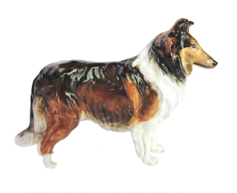 This striking small dog figurine by Royal Doulton out of England is a fine example of a collie breed modelled after “Ashtead Applause”. Expertly painted in a variety of dark and light browns with a white chest, shoulders and feet.