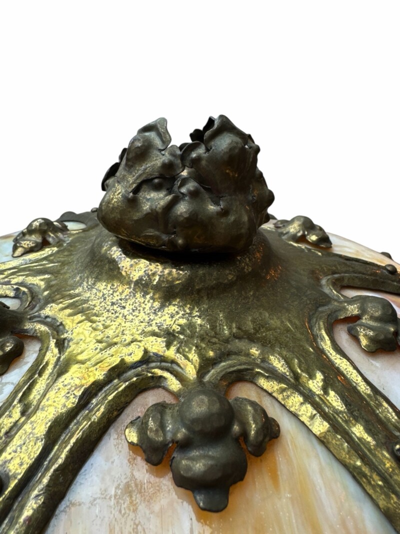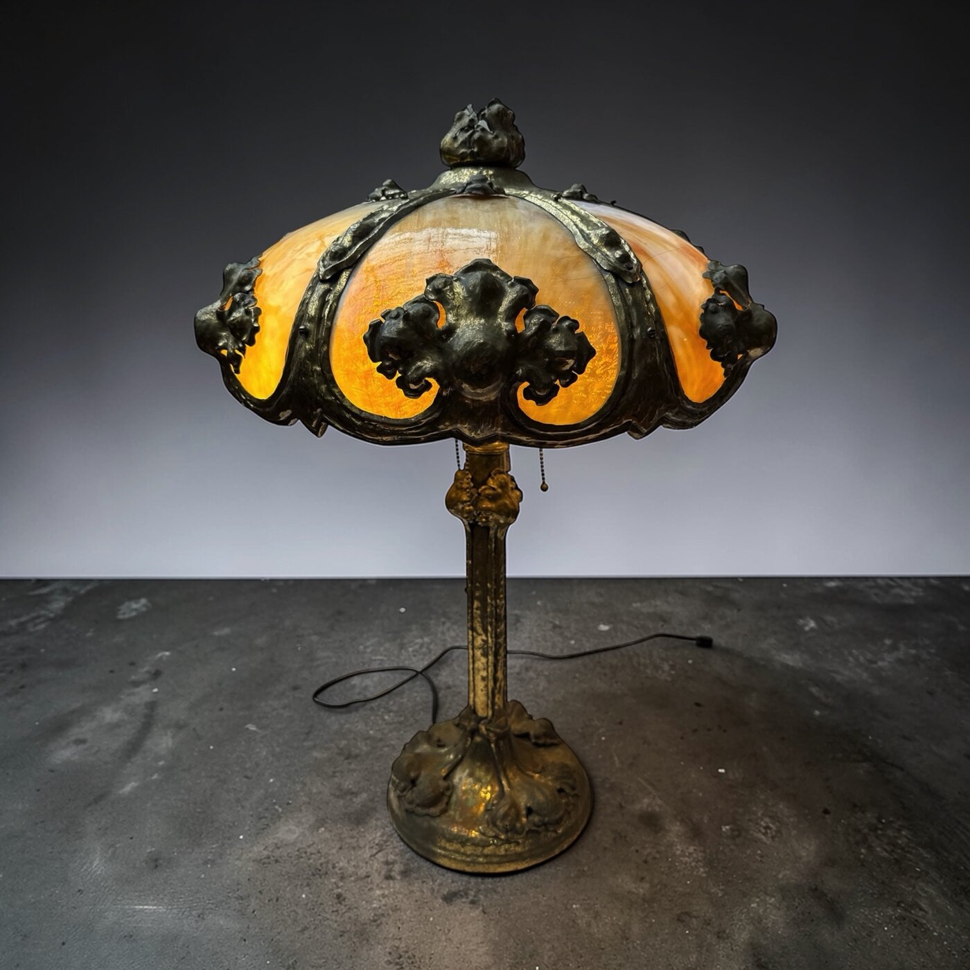 Luxurious decorative slag glass lamps of this type remain sought after for their warm illumination and sculptural metalwork, making them attractive additions to “inspired” interiors.