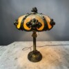 The lamp features a large caramel-coloured slag glass shade, composed of curved glass panels with attractive marbled striations that create a warm and inviting glow when illuminated. Slag glass—sometimes referred to as marble glass—was produced by combining opaque and translucent glass during the pressing process, creating the distinctive swirling patterns that became highly fashionable around the turn of the 20th century.