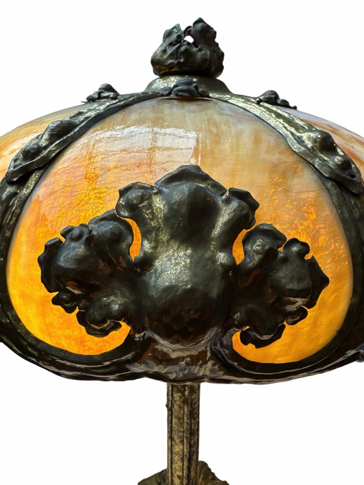 Impressive American Art Nouveau Slag Glass Table Lamp, Lavish Cast Metal Ornamentation 1900-1915