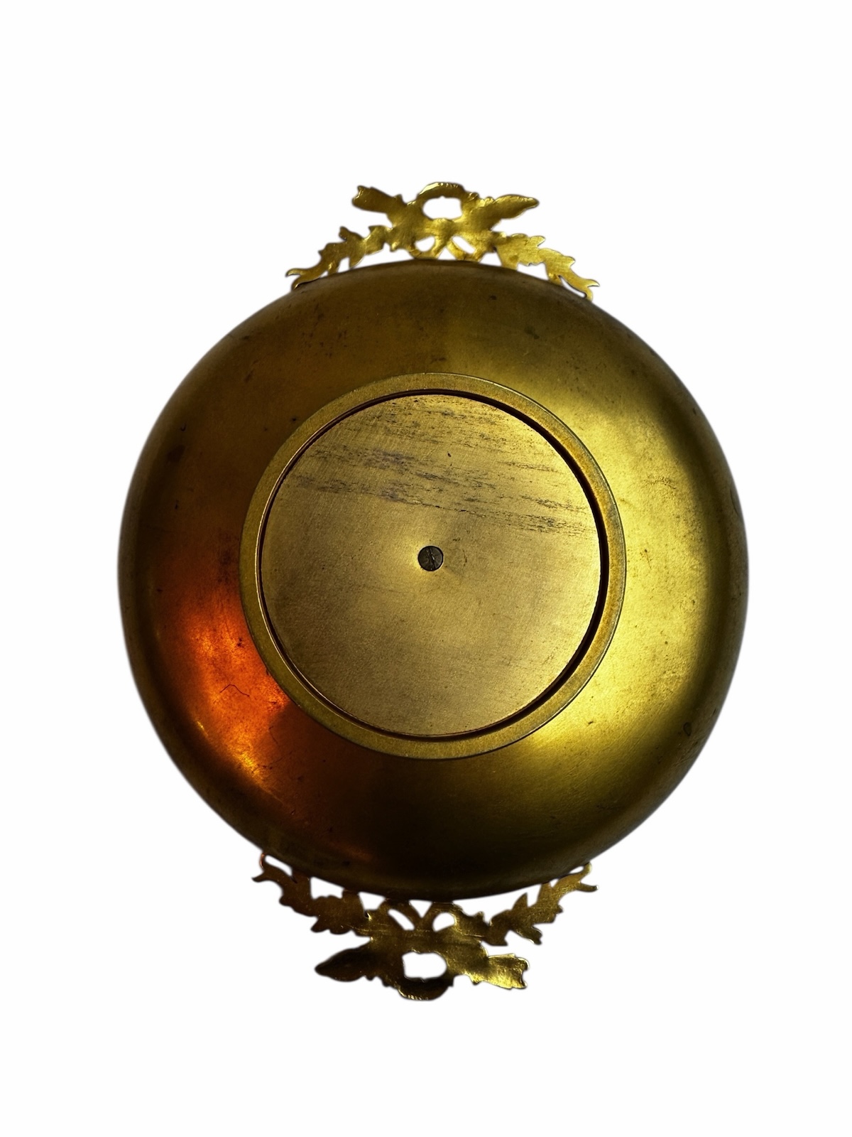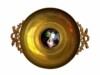 The tazza, is a shallow dish mounted on a bronze circular base or foot and used for serving. Crafted from bronze, with detailed decorative “motifs” in circular banding that surround and frame a central roundel of a beautifully hand-painted enamel plaque. A technique for which Limoges, in south western France, is well-known.