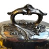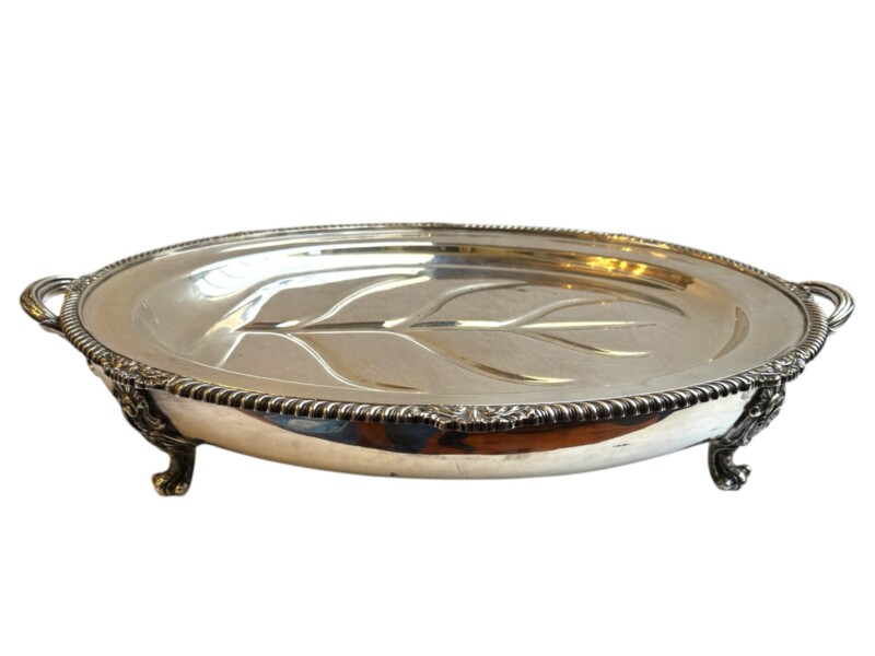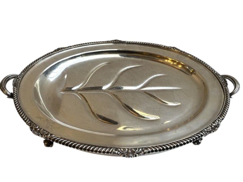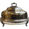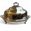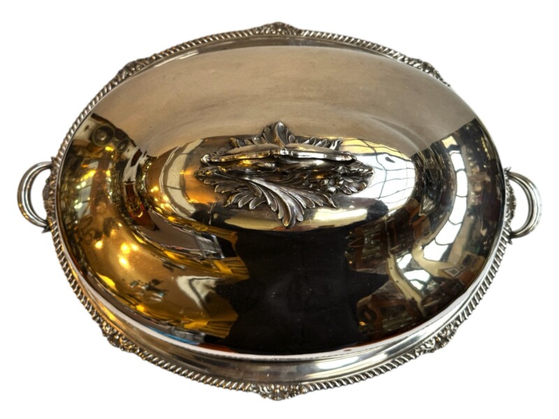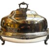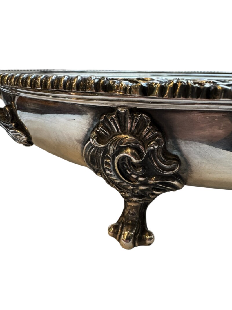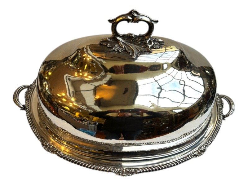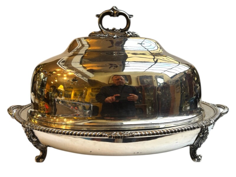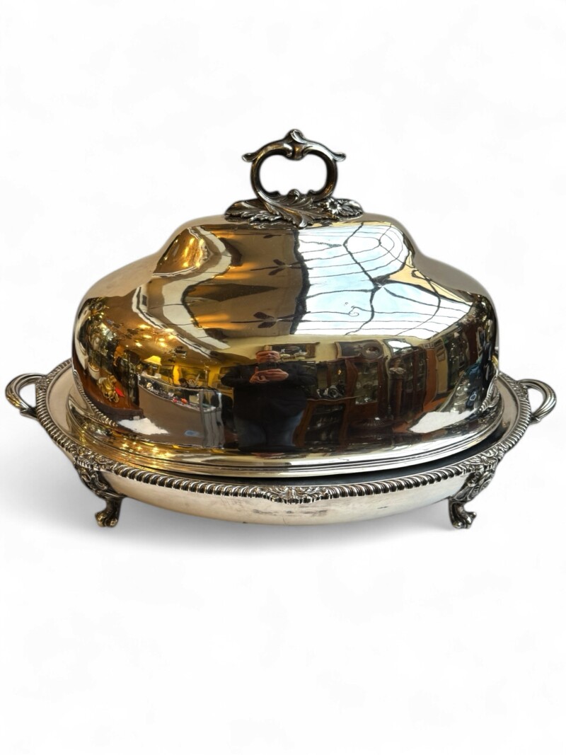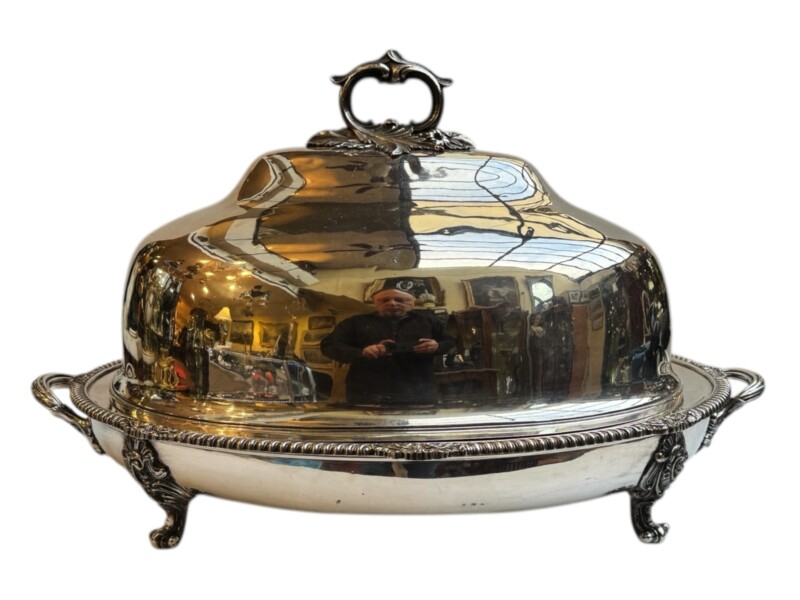 v** SOLD ARCHIVES **vThis very grand, good quality Sheffield silver plated “meat dome & hot water tray” is by the Mappin Brothers of Sheffield England, Circa 1835-1850. Lovely ornate and detailed cast decoration on the handles, the skirt and supporting feet. The rich silver motifs extend from the scrolling feet and handles to the rims and even the finial to give this vessel a truly luxurious touch. The serving dish, which could be used for a variety of delectable meats, is complete with its original silver plate dome cover (interior lined in tin/pewter) and a liner tray that allowed the base to be filled with hot water to keep the entrée piping hot at the table.