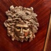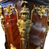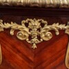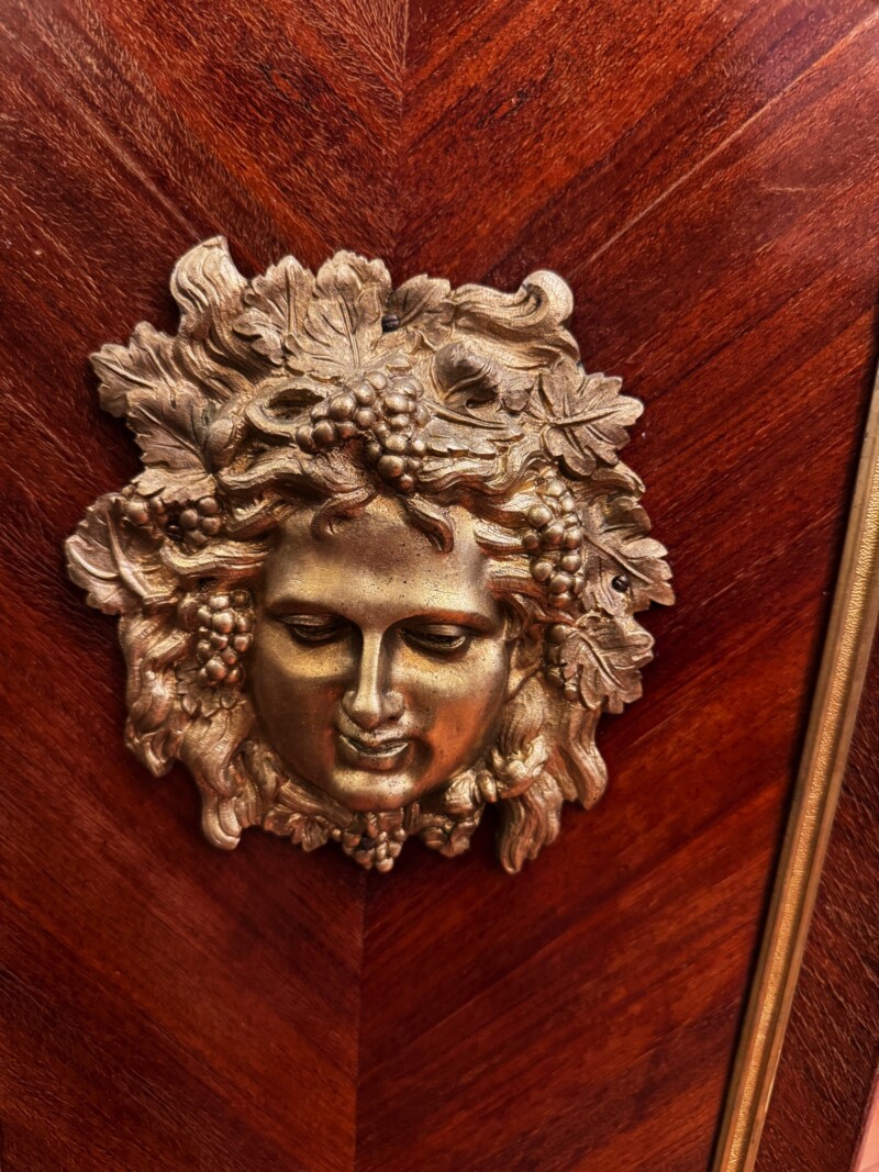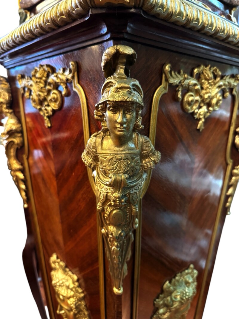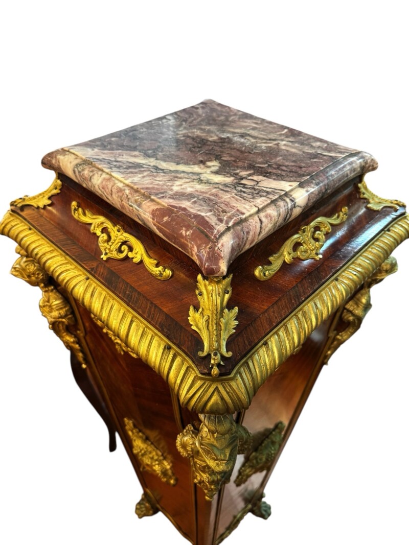 A luxuriant ormolu relief medallion of a “Bacchus mask ” centered on each side and set on the exceptional veneered kingwood background. Each corner of the slender most decoratively shaped body has an ormolu sculptural relief of a “Greek warrior” . Above is the original Brèche Violette marble top elevated on its own ormolu trimmed kingwood base. Note one corner of the marble is chipped but due to the square shape and repetitive ormolu applications, it could be turned to the back of any furniture grouping.
