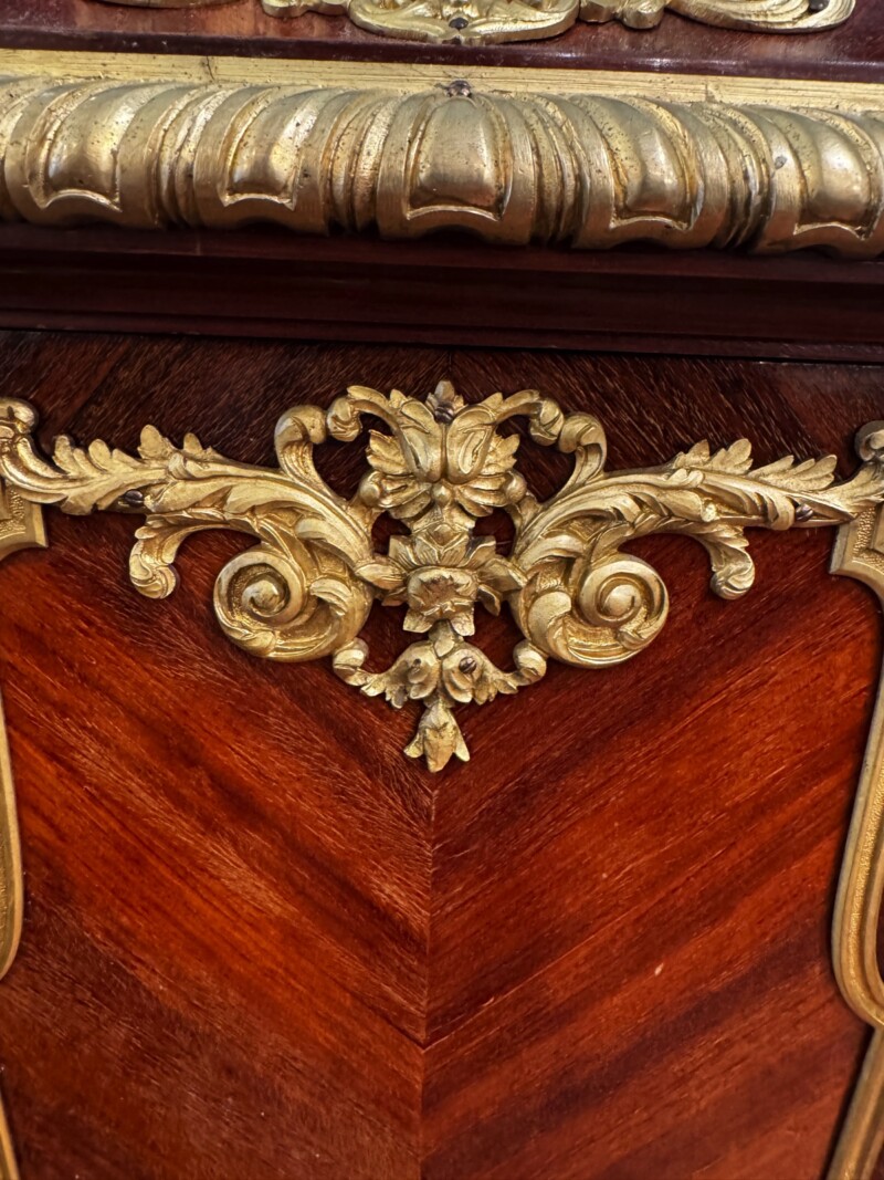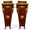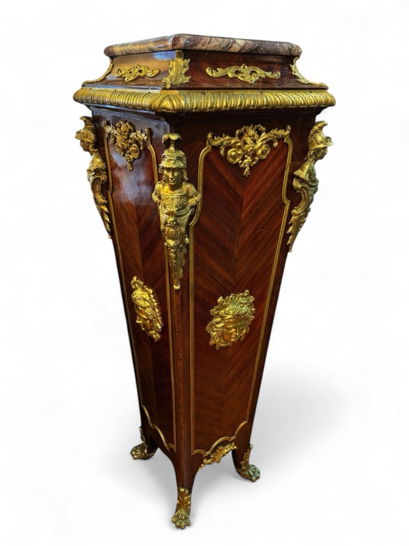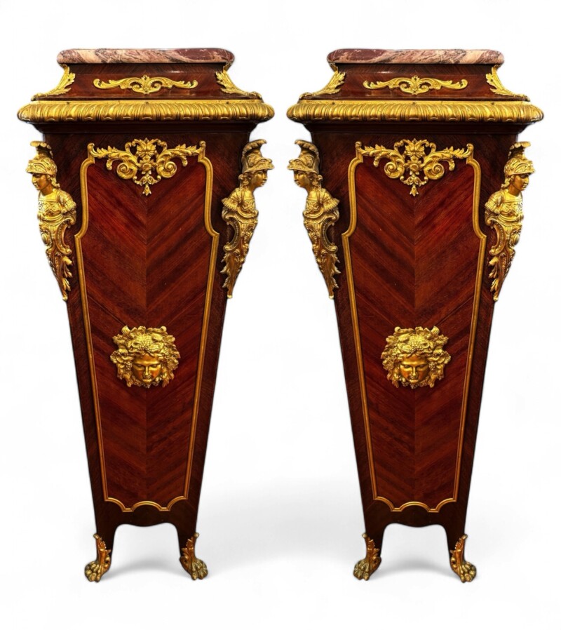 Furniture, GeneralAn impressive scale, tall and luxurious, highly decorated pair of French late 19th century Louis XV kingwood, bronze ormolu and Brèche Violette marble pedestal columns. The pedestal is raised by beautiful lightly curved legs with impressive finely detailed bronze ormolu fitted foliate acanthus leaf and lions feet “sabots or French hooves/shoes”.