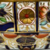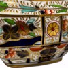 Decorative panels alternate with enchanting floral scenes. Panels are rimmed in gold gilt and beautiful rich cobalt blue flowing and forming gorgeous bouquets of “stylized flowers” in iron red, turquoise and yellow-green with gold gilt details.  The smaller panels have Japanese kamons in gold gilt with embellishments of iron red trim and bordered in cobalt blue. The bottom panel shows a richly decorated cobalt blue “vase of flowers” in a “garden” setting with a “fence railing” seen in the Chamberlain “Old Japan” pattern.