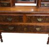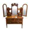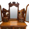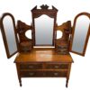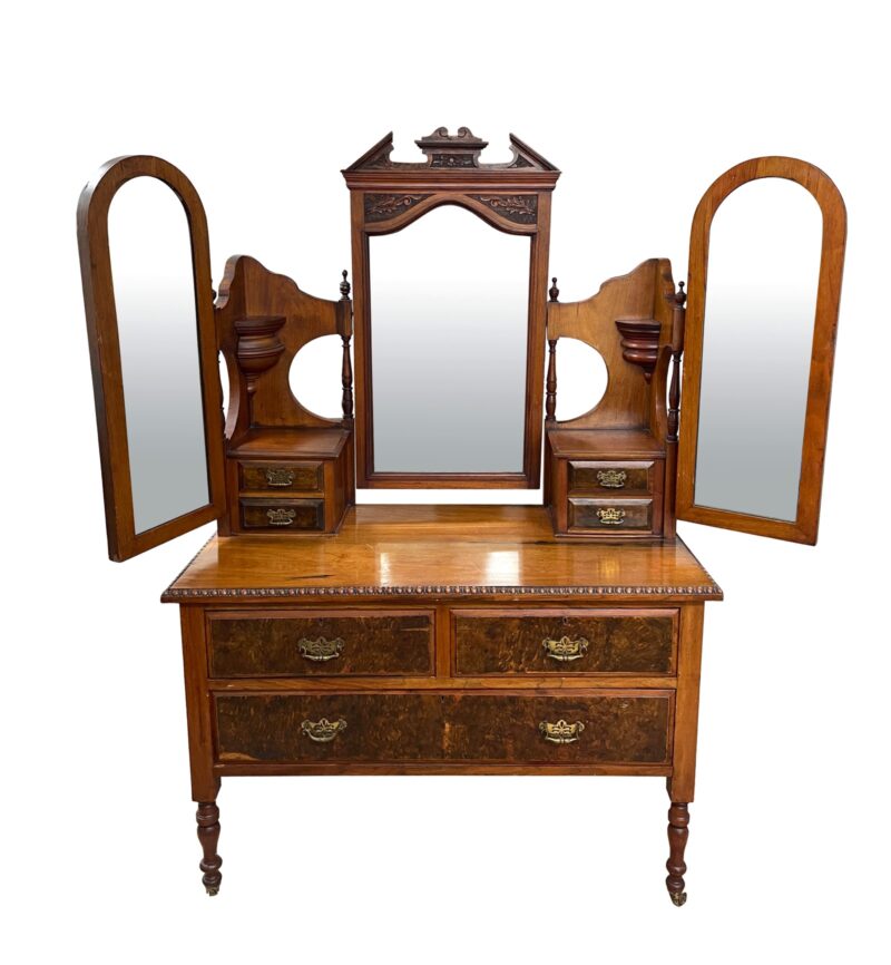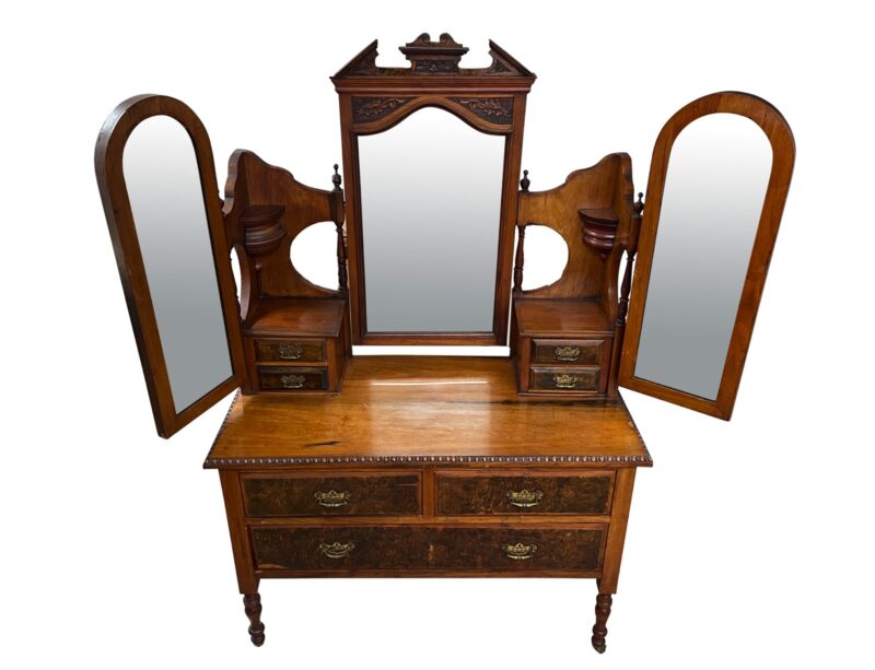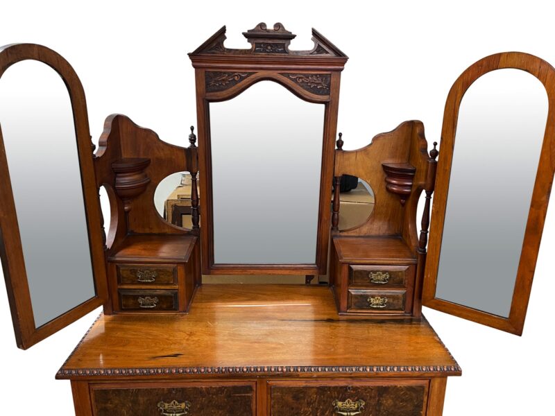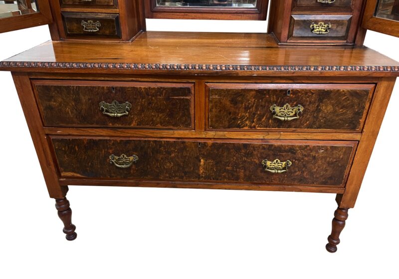 An Irish dresser / vanity with 3 main drawers and two small drawers with a mirrors attached.  There are three mirrors – with two of them on hinges for adjusting.  The fronts of the drawers are in a burled walnut and there is English Art Nouveau style carvings around the centre mirror.  The dresser/vanity sits on 4 narrow legs.