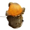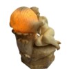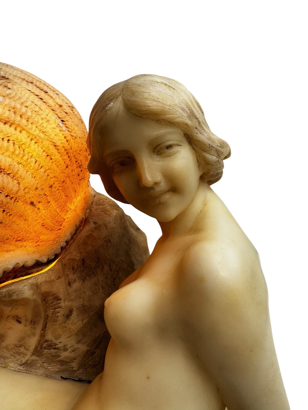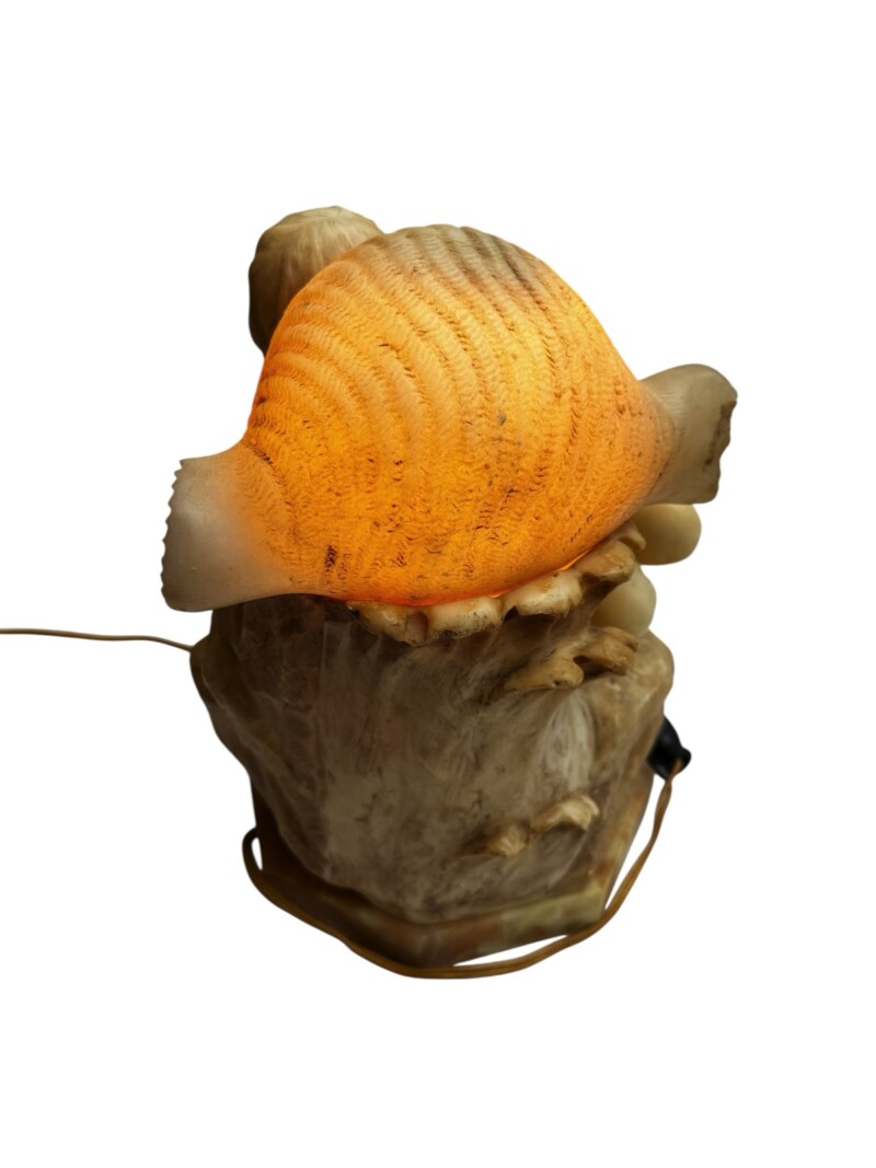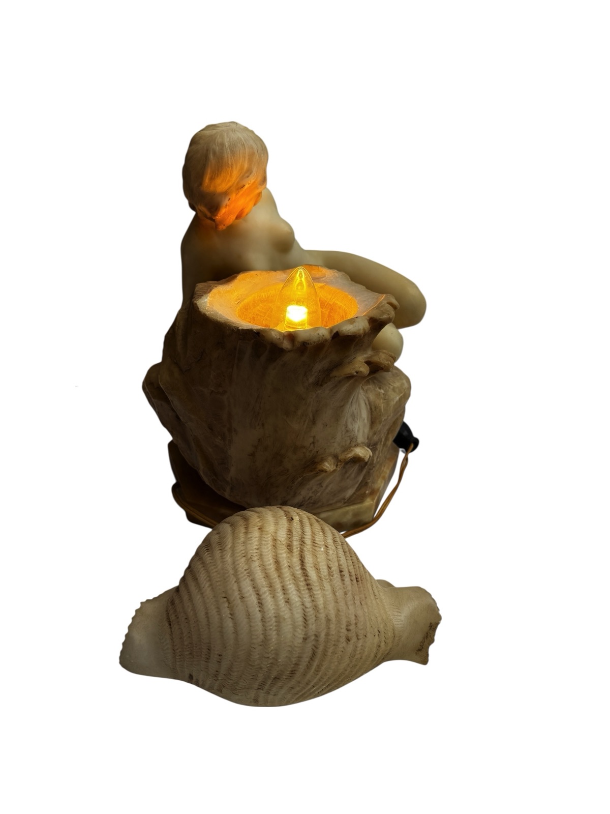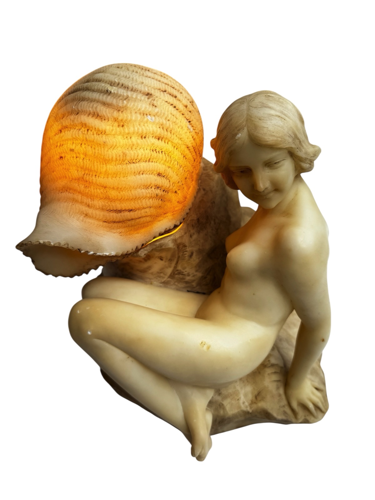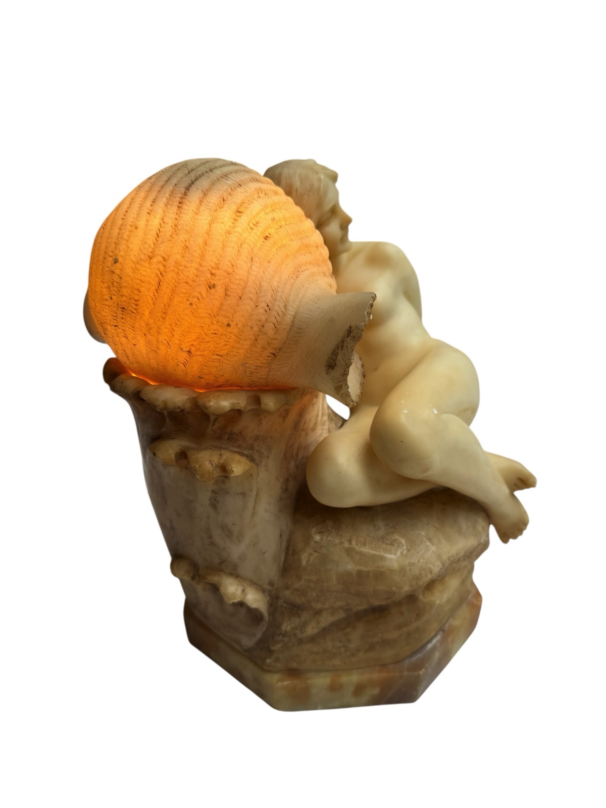 A beautifully hand-carved alabaster sculpture lamp depicting a reclining nude woman resting upon a rocky base, with a large carved seashell at her side. The seashell cleverly acts as the lid for the lightbulb, allowing the lamp to glow softly through the translucent alabaster, creating a warm and atmospheric effect.