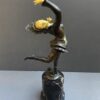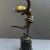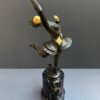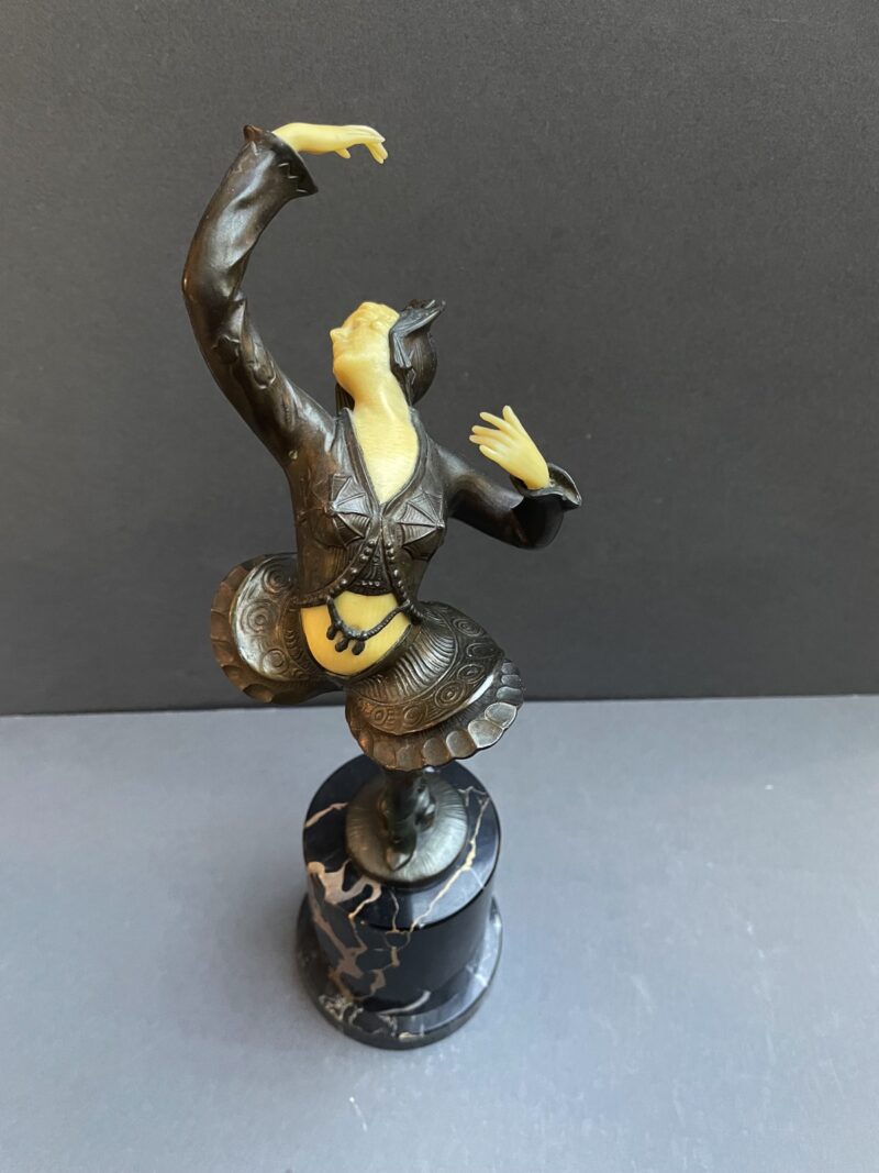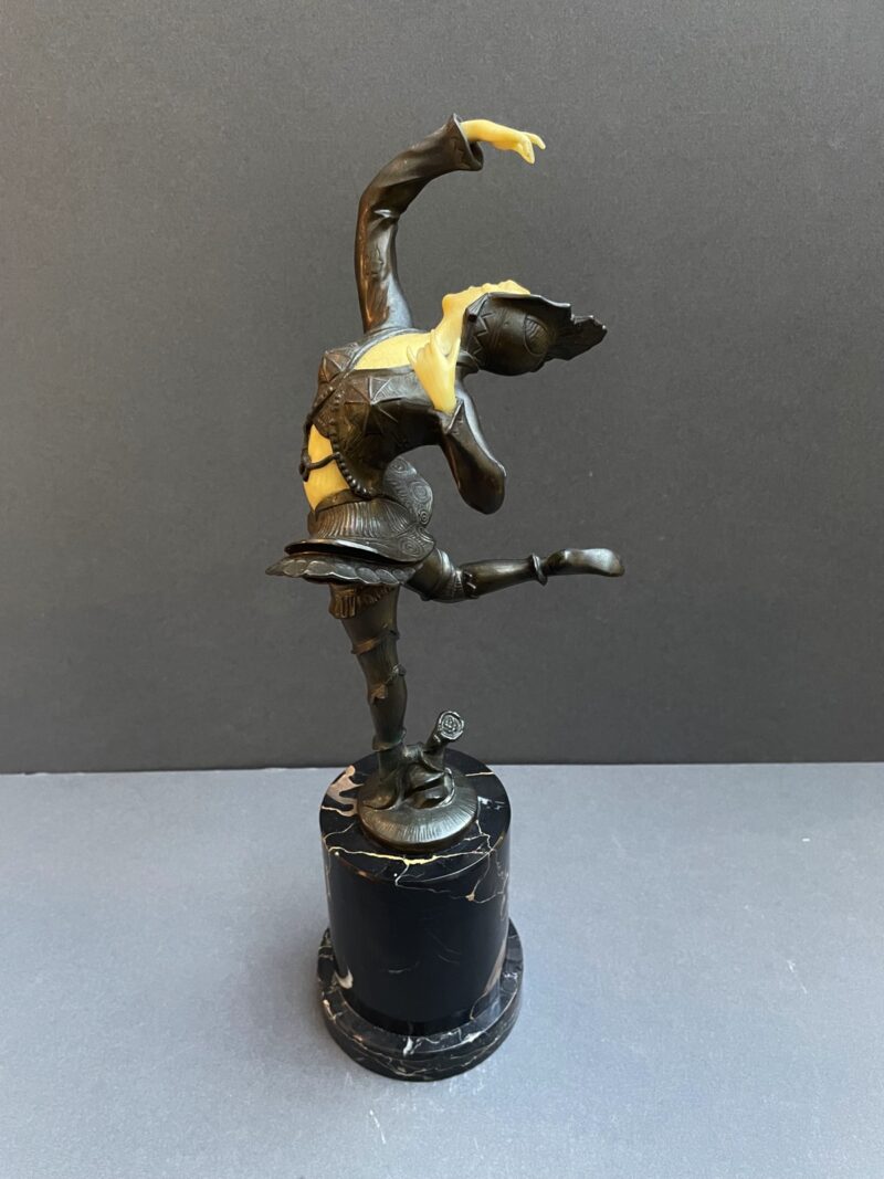 Italian Art Deco Bronzed Spelter and Faux Ivory Dancer Figurine, Attached Black and Veined Gold Marble Base