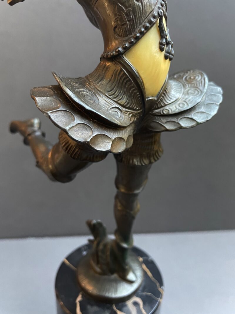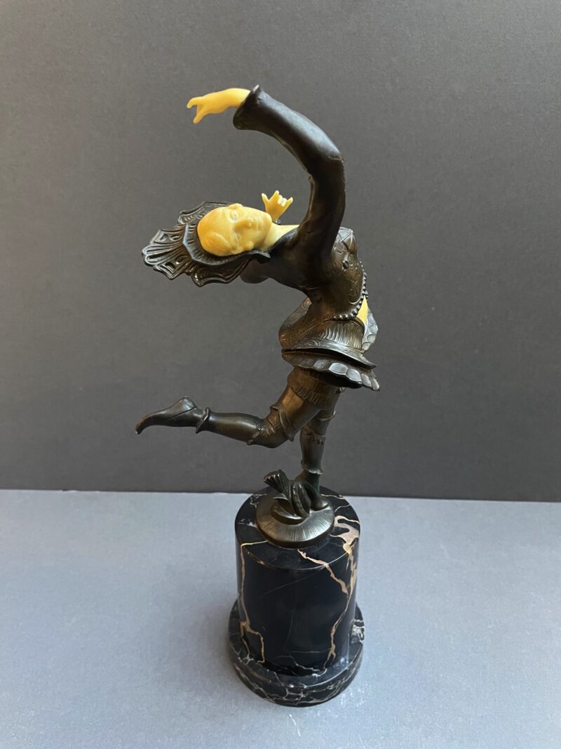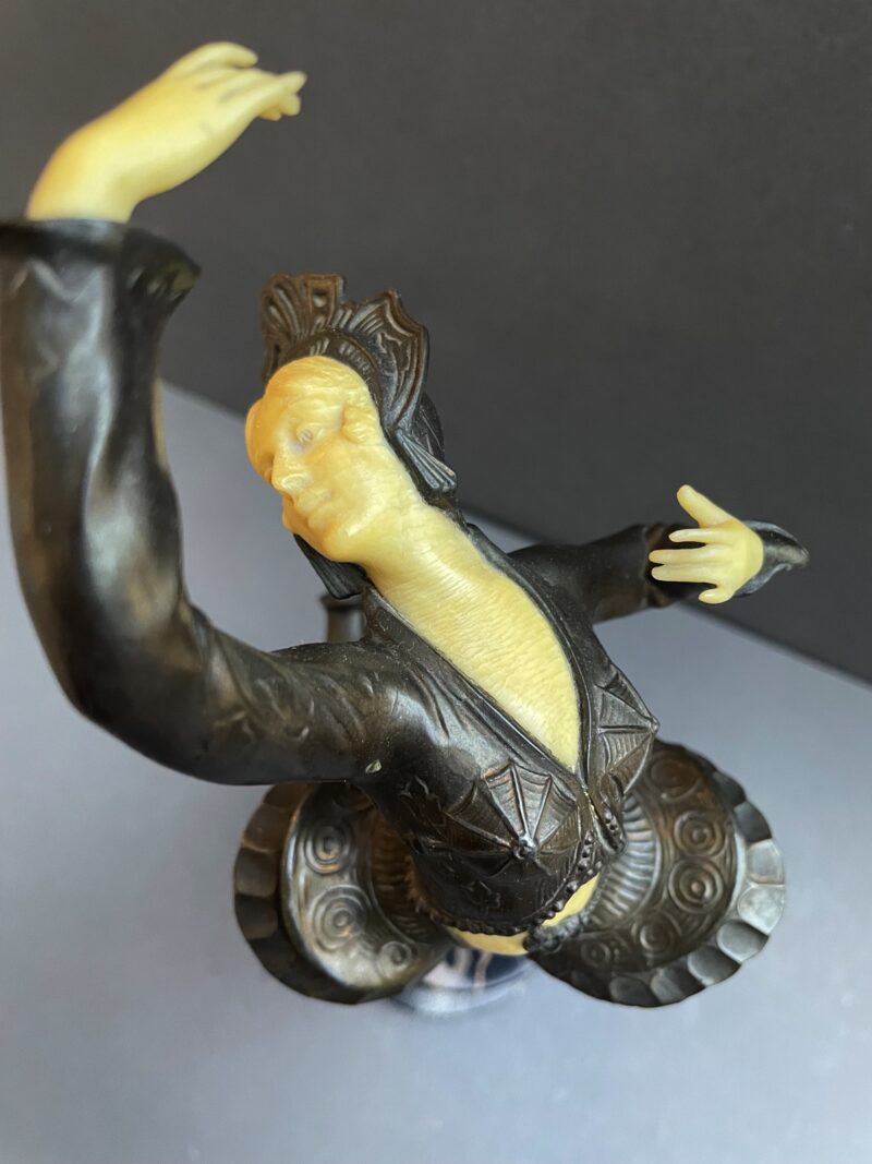 A beautiful Italian Art Deco spelter figurine of a dancer in a patina’d bronze colour, mounted on a black and gold marble base. The body, face and hands of the dancer are faux ivory.  In the style of Gerda Gerdago and Demtre Chiparus.  Dates circa 1930/1940.