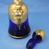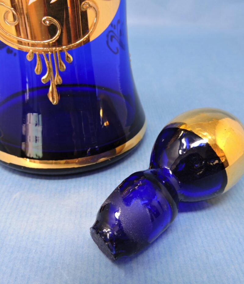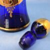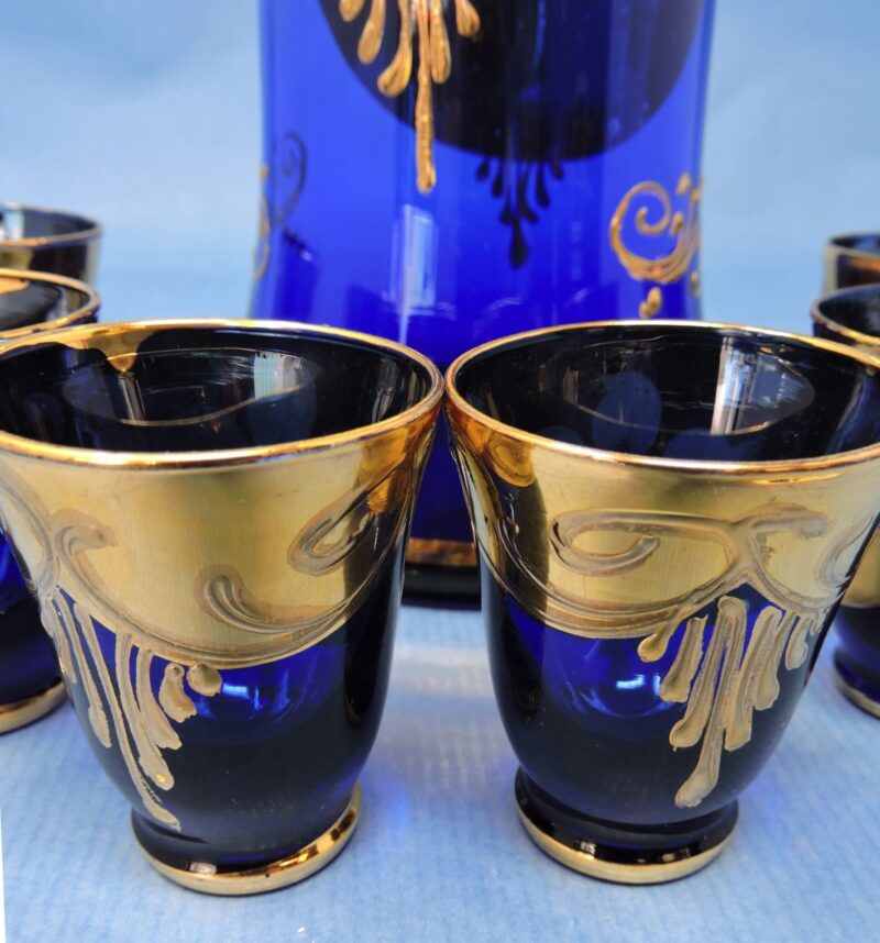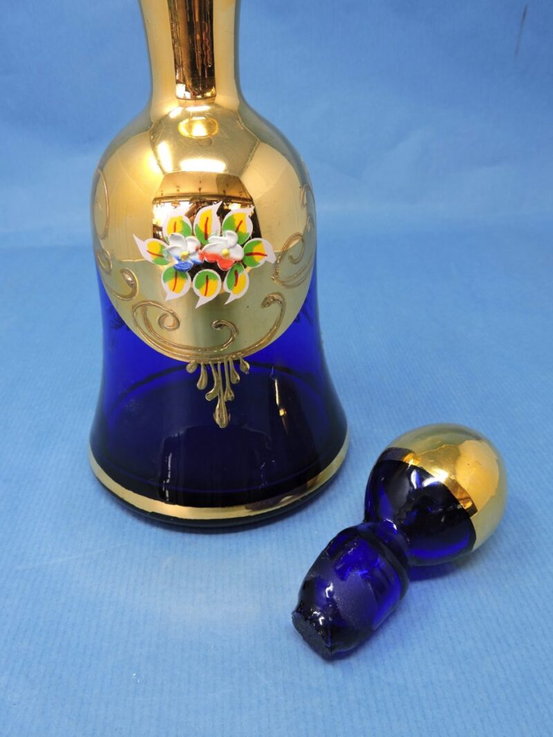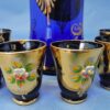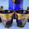 A gorgeous Italian cobalt blue glass liqueur decanter with 6 matching shot glasses. The set has lavish gold decoration, applied colourful flowers and enamelled leaves.