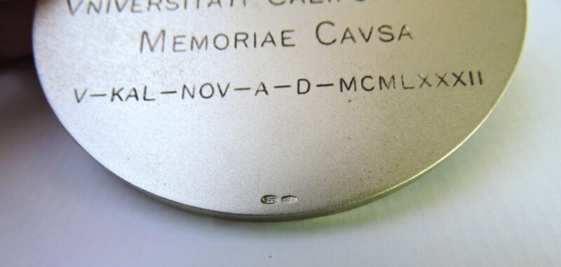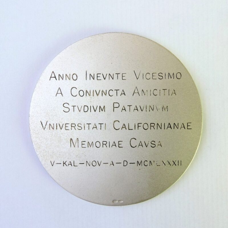 On the reverse of the coin is the Latin inscription “Anno Inevnte Vicesimo A Conivncta Amicitia Stvdium Patavinvm Vniversitati Californianae Memoriae Cavea”, along with “V – KAL – NOV – A – D – MCMLXXXII” and the numbers 800 and 485.