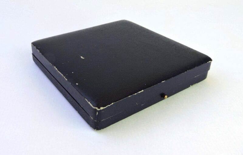 The box is 4 3/4 inches square and is stamped “Lorioli Fratelli, Milano – Roma” on the interior. Please note that there is some wear to the leather exterior.