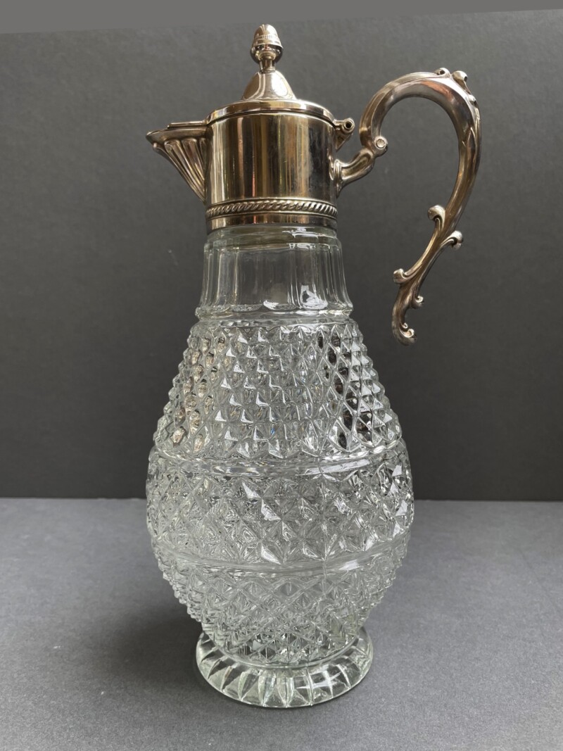 Italian Patterned Glass and Silver-Plated Claret Jug, Hinged Lid, Decorated Handle