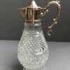 A pretty Italian patterned glass and silver-plated claret jug with a hinged lid and a decorated handle.  The jug measures 12 inches tall from the tip of the lid finial to the base. It is 6 inches wide from the tip of the spout to the handle.