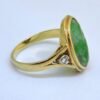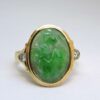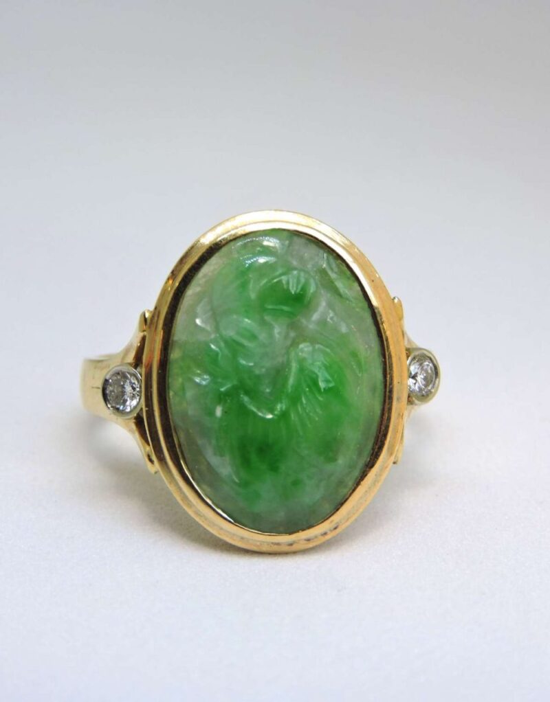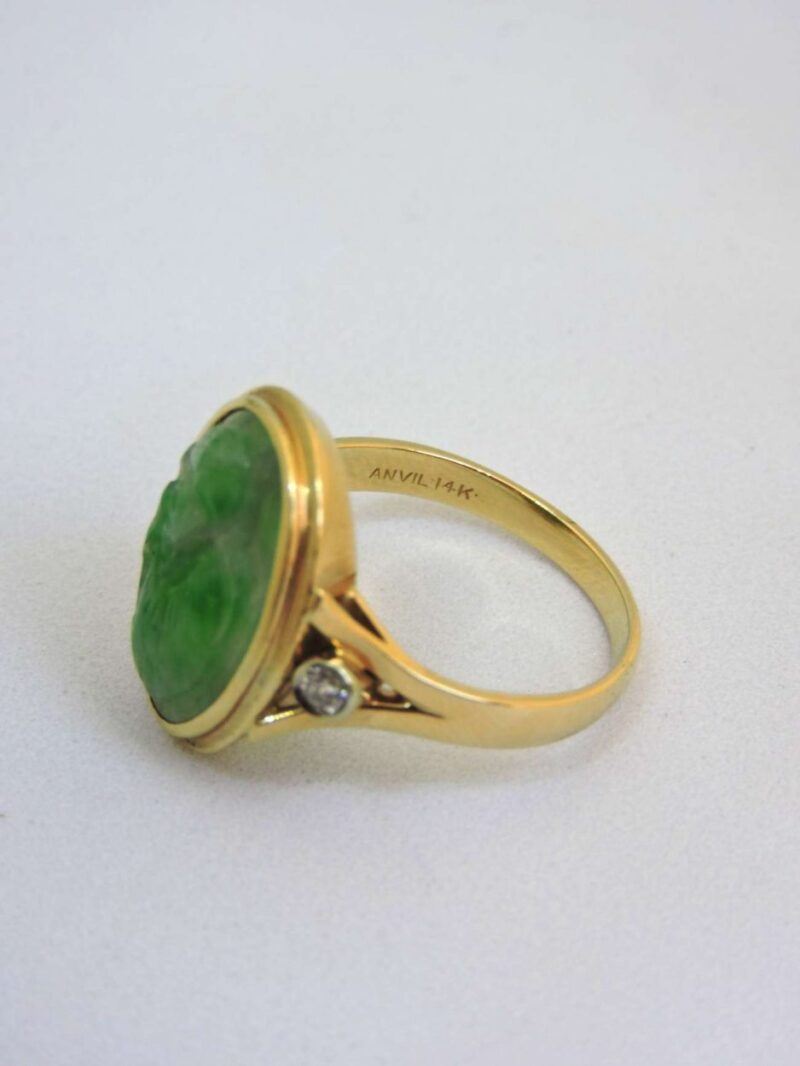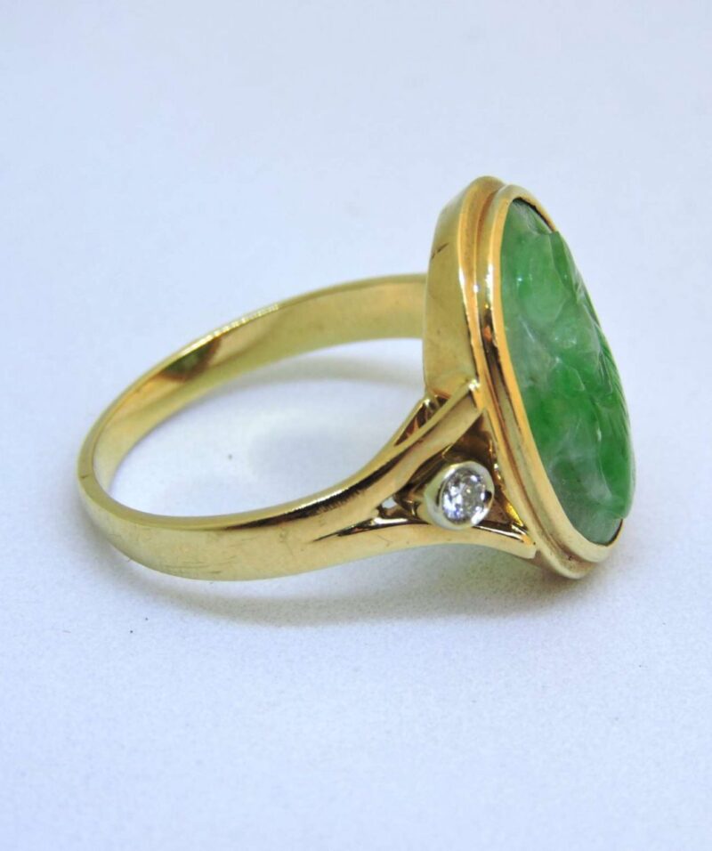 Engraved Green Jade, Diamond & 14 kt Gold Ring