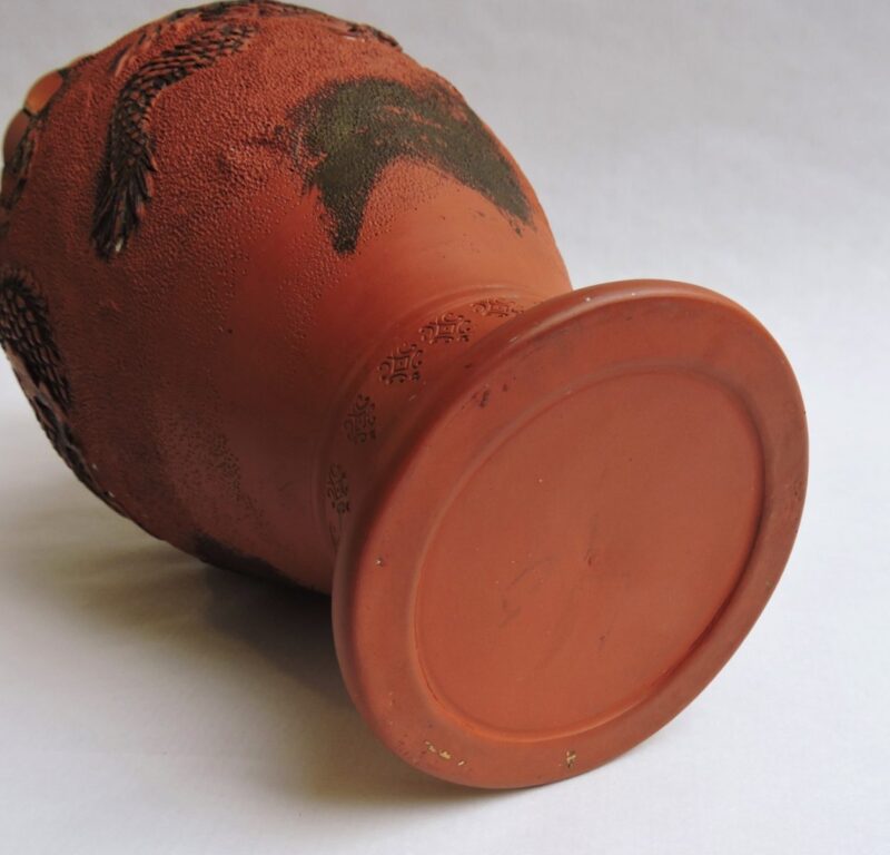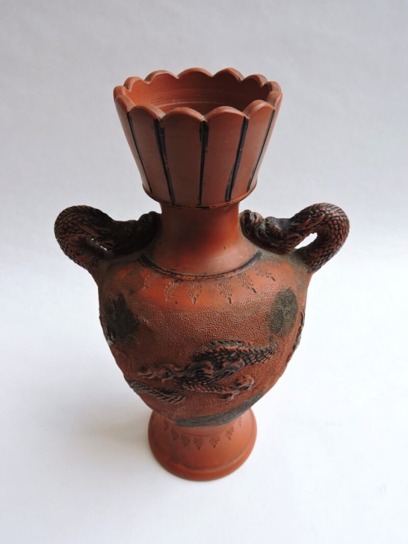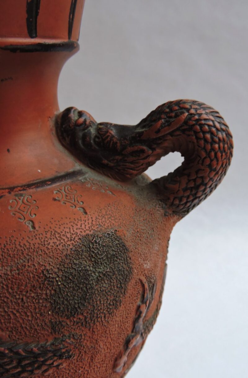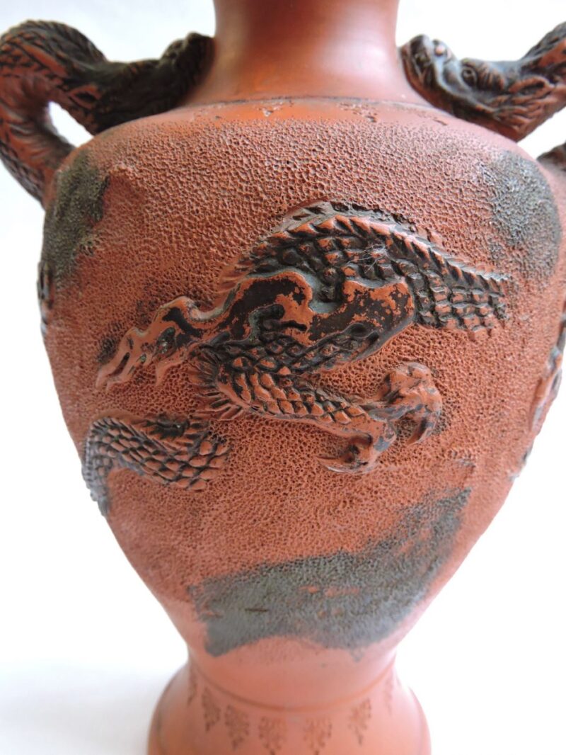 Japanese Meiji period (1880) Terracotta Two-Handled Vase, Dragon Decorations on the Handles & Body