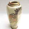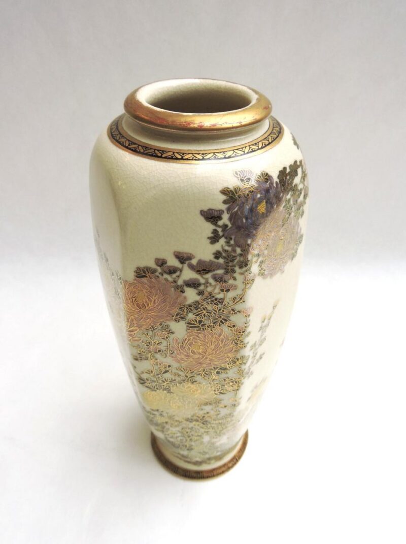 This Satsuma vase from Japan is tall and slender and is decorated with multi coloured chrysanthemums in mauve, blue, pink and yellow, all highlighted with gold over the blooms, green leaves and grass. Thick gold decorative banding on rim, shoulder and base of the vase. Typical crazing shows.