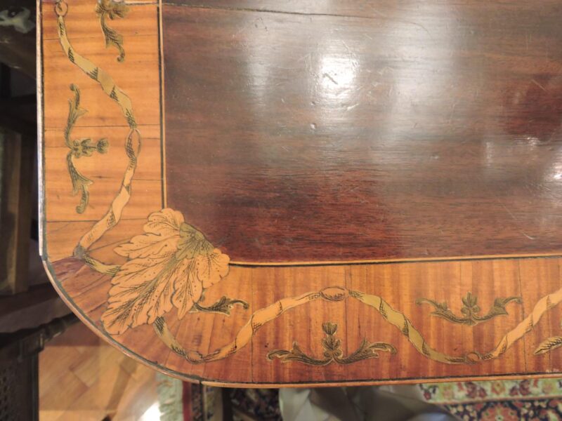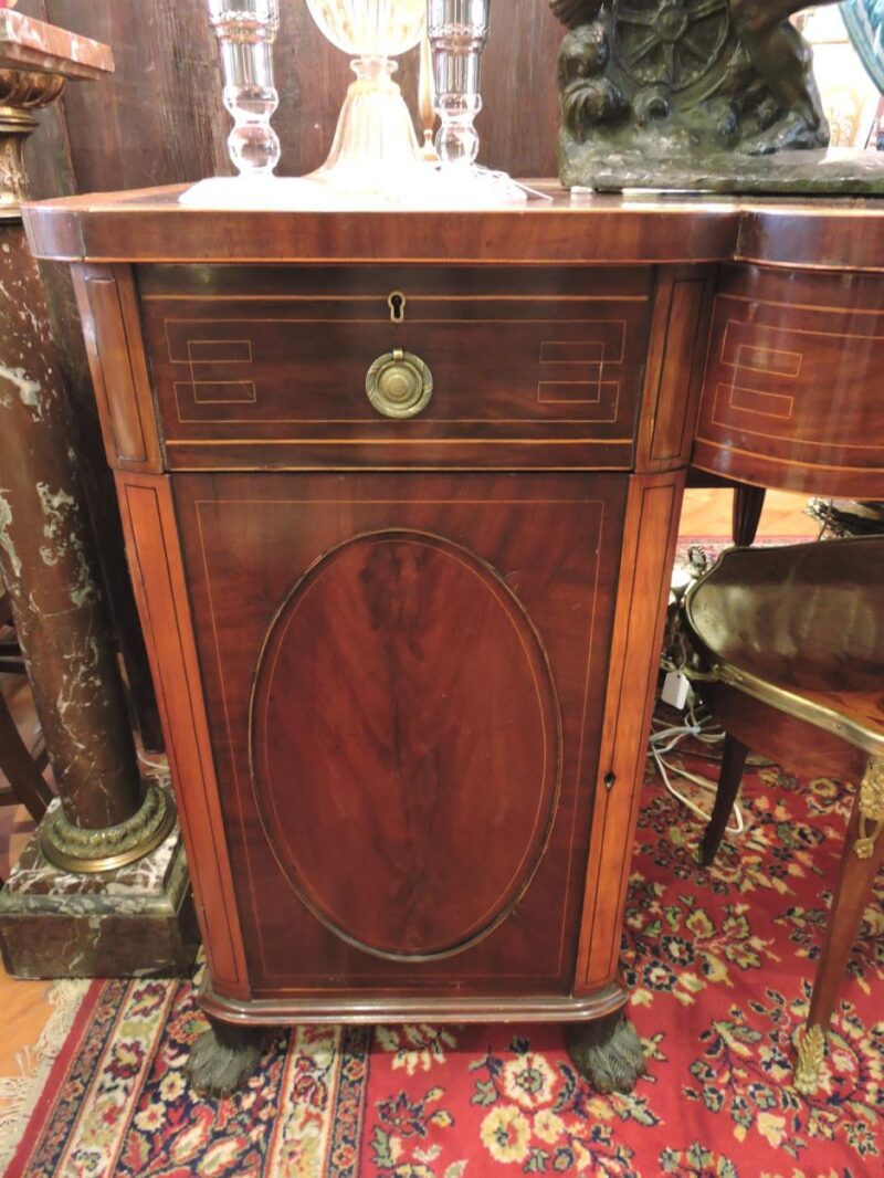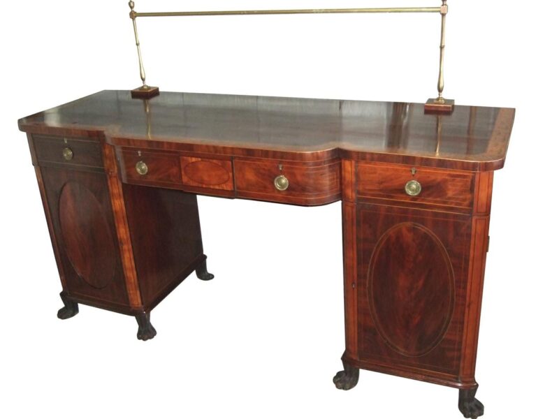 A very handsome sideboard in mahogany with satinwood inlaid banding.  The banding around the perimeter of the top is decorated with oak leaves and branches.  Two doors open to reveal shelves and 4 drawers open at the front.  Ovals decorate the doors and a brass curtain rod at the back.  The sideboard sits on carved lion paw feet.