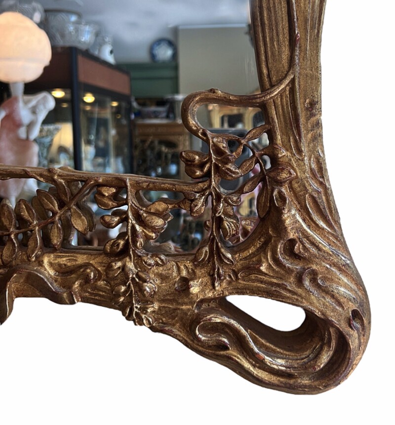 A very large gilt wood Art Nouveau style mirror with a beautiful stylish gold frame decorated along all sides. The asymmetrical curvilinear flow of scrolling foliage elements of iris blooms and buds with reeded frame swag detail. The mirror is backed in wood with the long gold frame and mirror in very good condition. This is a sophisticated piece of design in the Art Nouveau style.