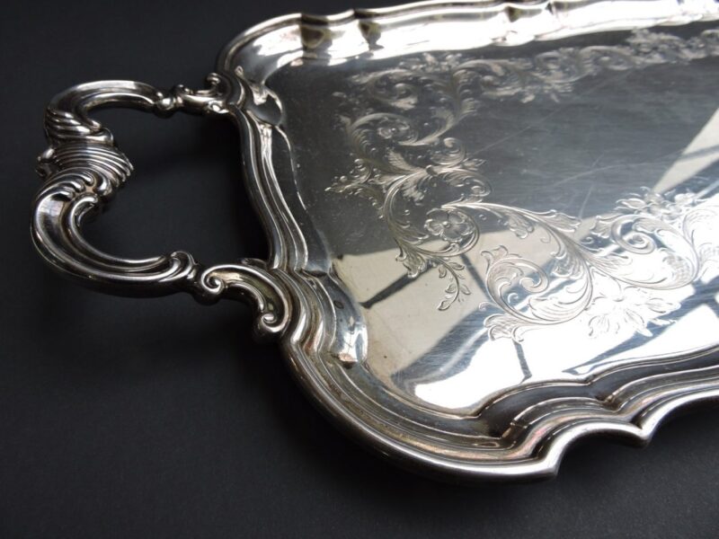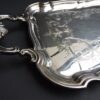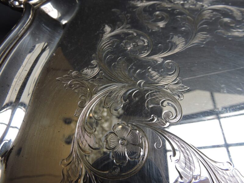A beautiful, large two handled “Sandwich Tray” by Birks in Sterling – with hallmarks dating the tray for 1950.  The handles are decorated in scrolls and shell and the top of the tray is hand chased.