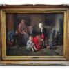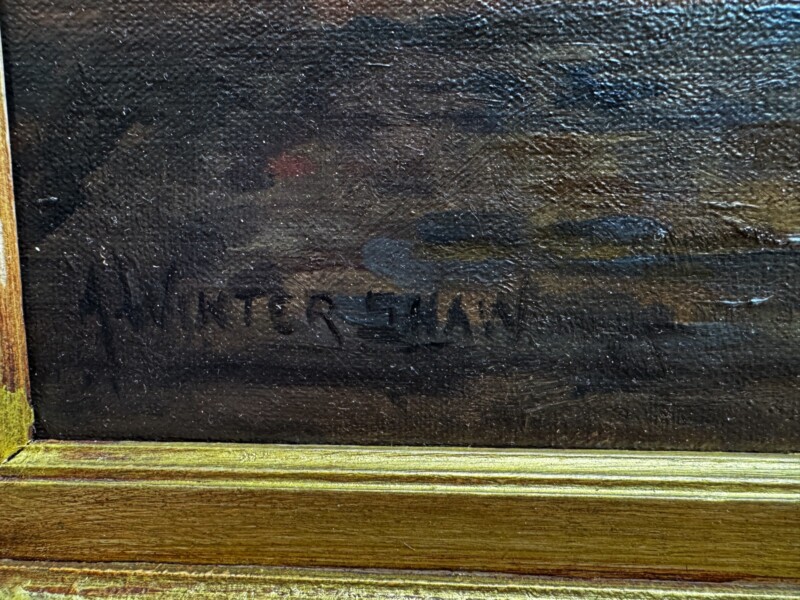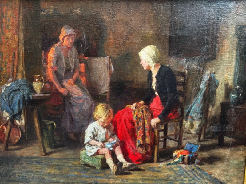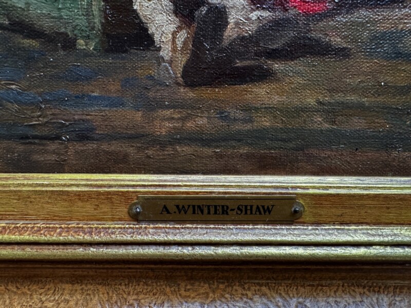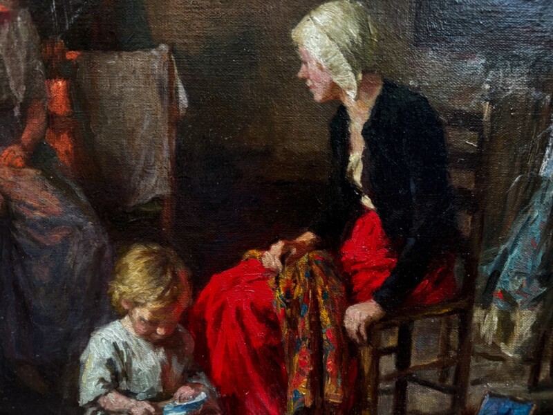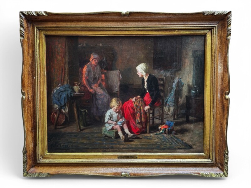 ArtBritish painter Arthur Winter Shaw (1869-1948) was born in Peckham England, the son of a clerk to the War Office. He studied at Westminster School of Art, the Slade School of Fine Art and in Paris. He moved to Amberley in Sussex around 1904, where he became a part of a vibrant artistic community founded by Edward Scott. Shaw was inspired by Edward Scott’s “atmospheric” and “twilight” paintings as evidenced in this work by Shaw of an interior scene with the gentle illumination of the central figures “mother and child sewing”. The sophisticated play of firelight casts a warm shadow on the peripheral figure framing a triangular composition in shape and colour that holds the “eye” to examine the central story unfolding, a frozen moment in time. Artist signature is on the front lower right and name plaque on the wood frame center front.