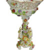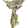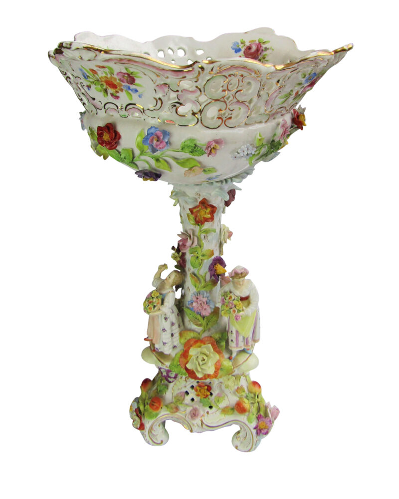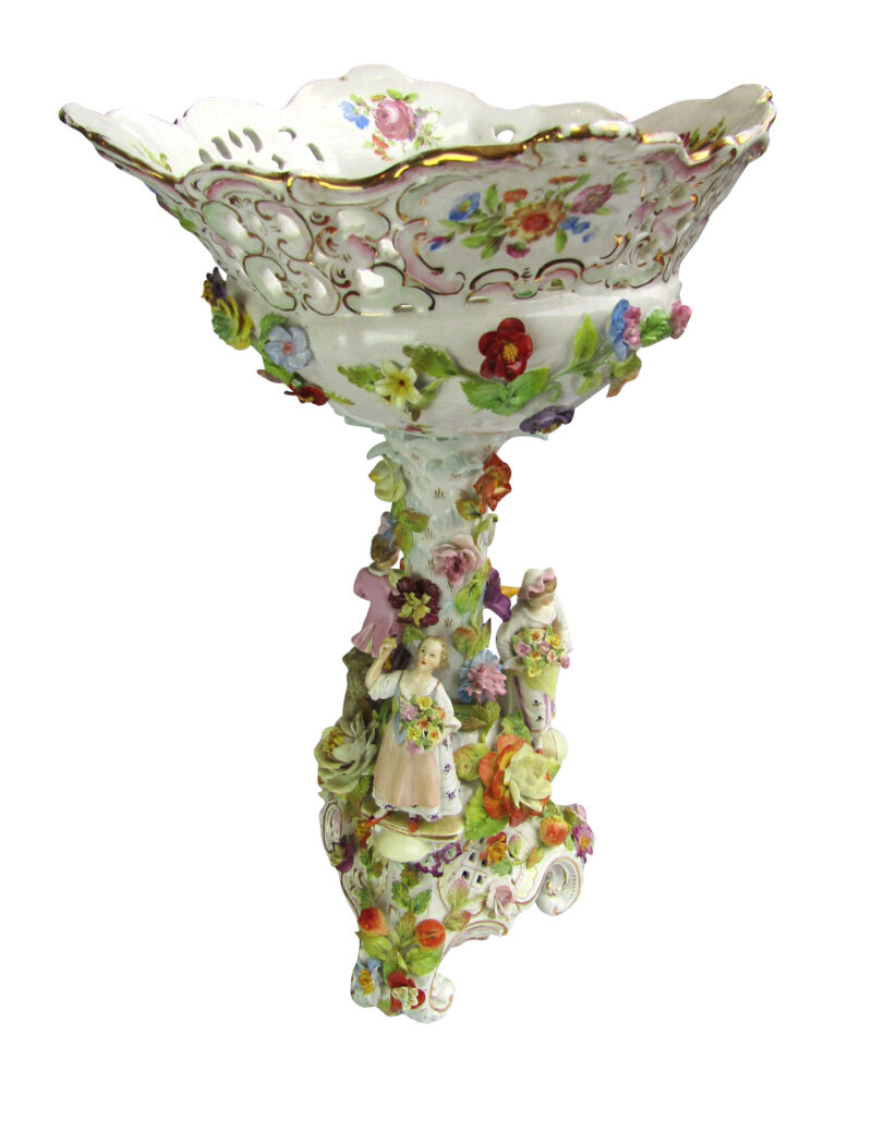PorcelainsA wonderful large porcelain figural centrepiece bowl, signed by Carl Thieme, Dresden Germany. The white bowl has colourful painted flowers and a butterfly on the inside and flowers on the outside as well as applied flowers on the exterior. There are also gold swirls and accents all over the bowl. The base has 3 child figures surrounding the pedestal.