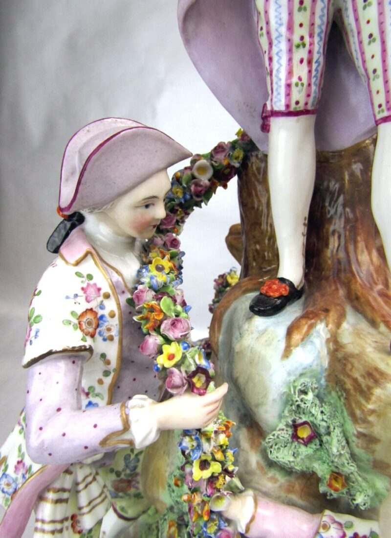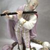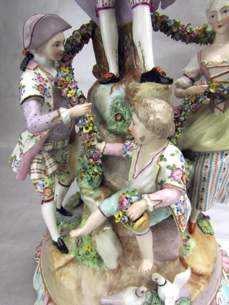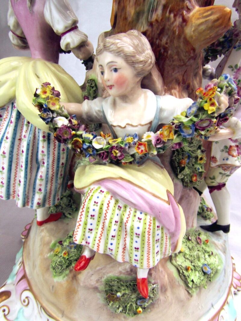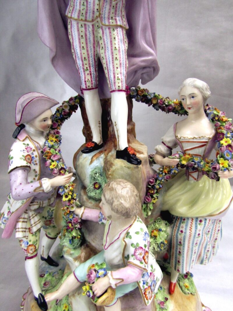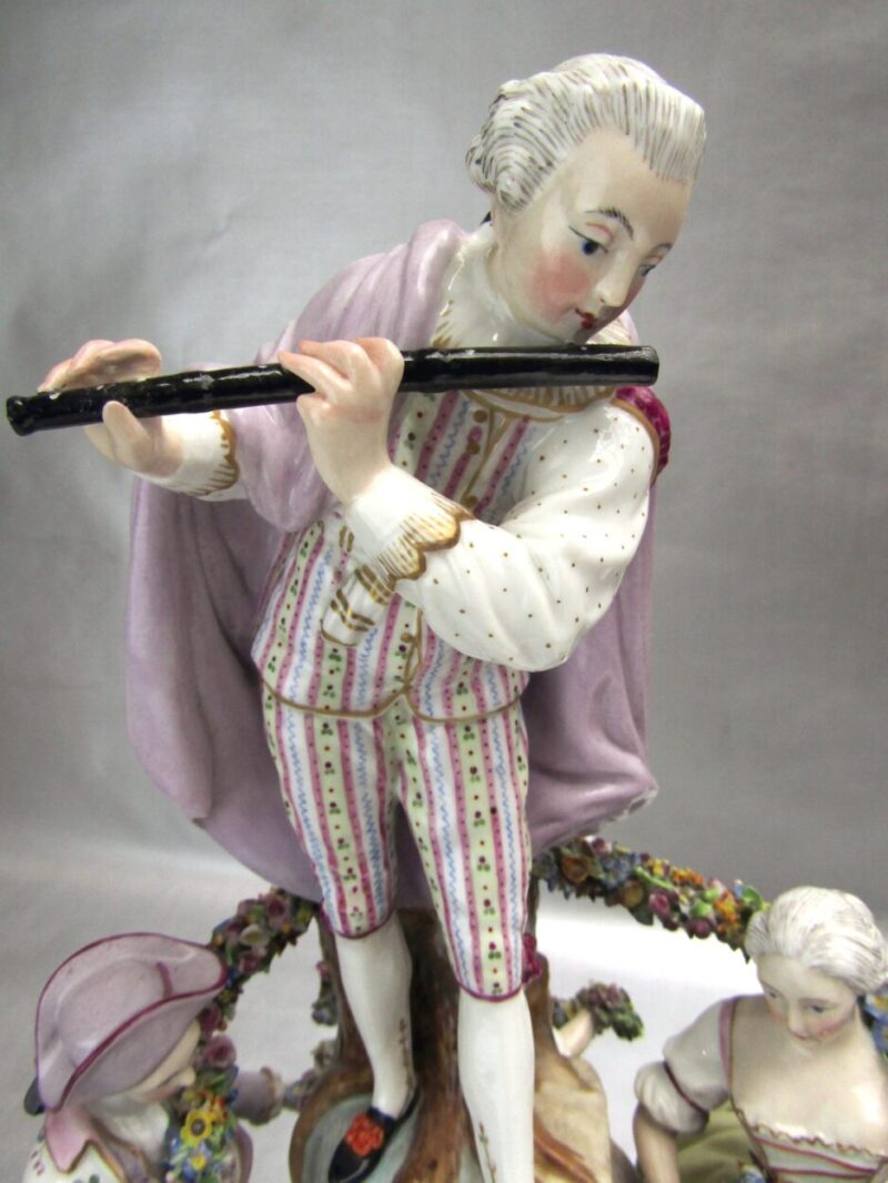 A 19th century German porcelain very large porcelain figural grouping centrepiece with 5 figures as well as painted and applied flowers.  The grouping is tiered with 4 figures on the lower level surrounding and listening to the gentleman who is playing flute above them.