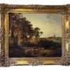 A stunning large oil painting of a British landscape with trees, fields – focusing on a herd of sheep in the foreground (and shepherd) and a windmill & horse & buggy in the distant background. Framed in an exquisite Gilt wood & Gessoed frame.