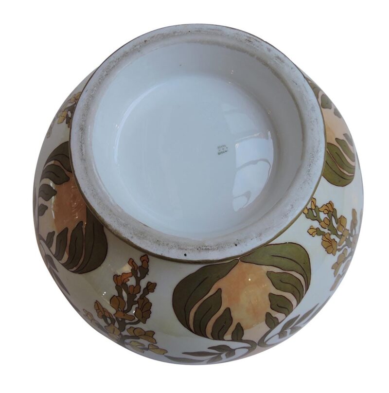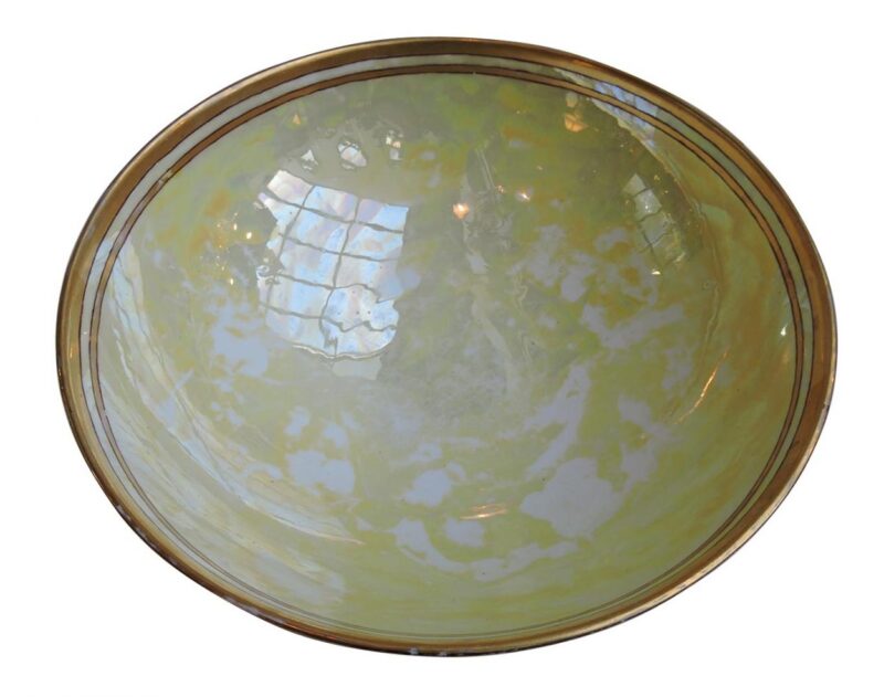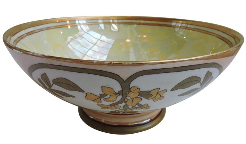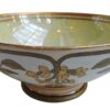 This is a stunning large French Limoges pedestal centre bowl with an pale iridescent yellow interior. The exterior has a floral design over white surrounded by an iridescent peach background.