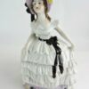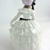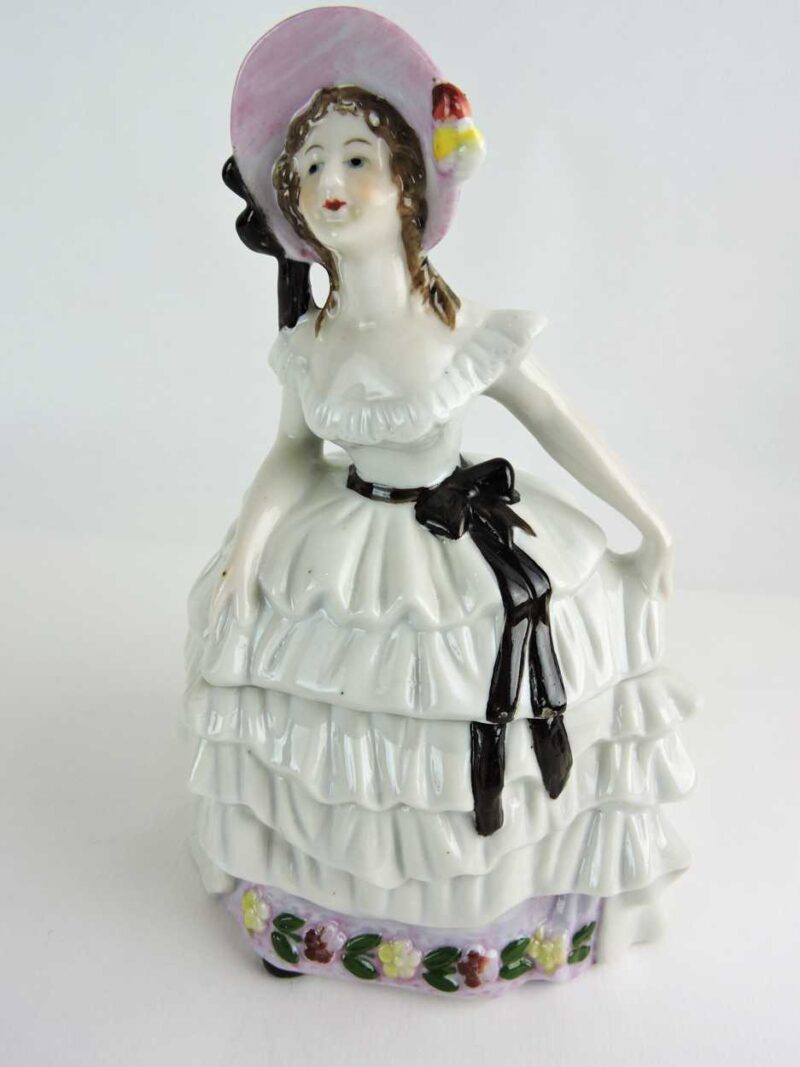 Large German Figural Porcelain Powder Box – Lady in White Ruffled Dress With Black Ribbon