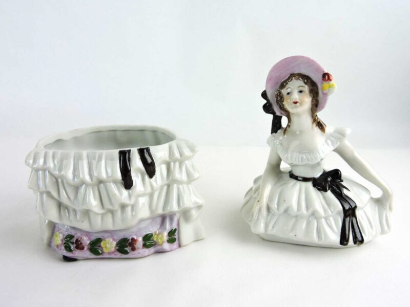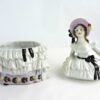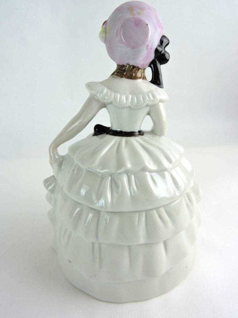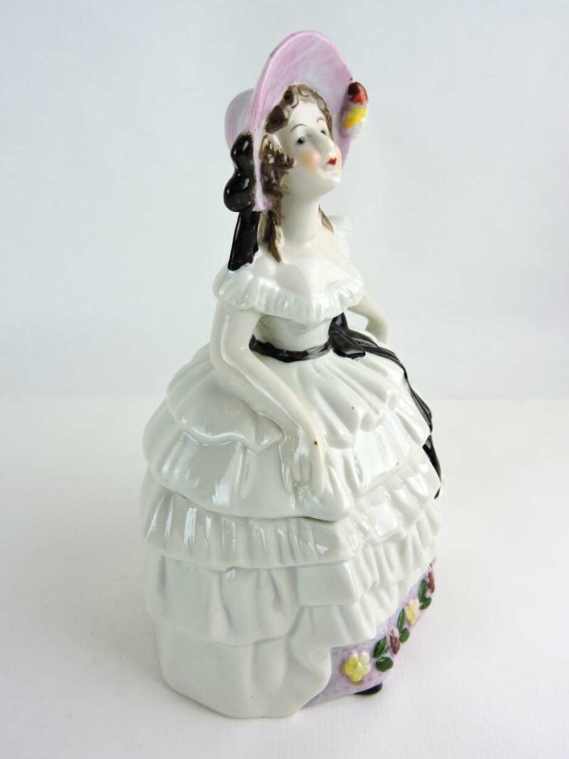 A large vintage porcelain powder box that features a woman in white ruffled dress with black ribbon and a pink bonnet. The figure is all hand painted.   The top half lifts off.  This beautiful lidded jar originally used as a powder box can also be used for jewelry, vanity accessories or keepsakes.