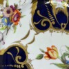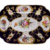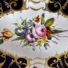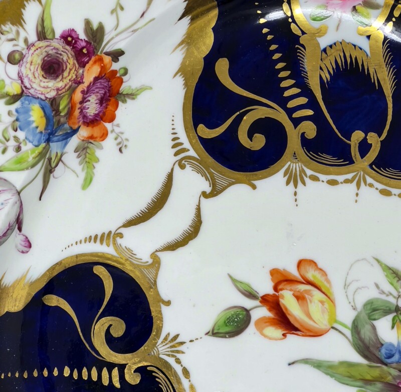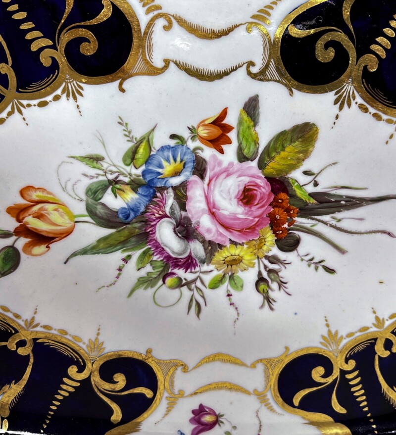Stunningly beautiful antique Coalport porcelain platter, circa 1810. The cobalt blue areas are gloriously set in contrast and outlined with accented gold garlands surrounding areas of delicately hand painted flowers. The unique gold trim design outlining the dish shows slight signs of wear that really only add to the “story” of this platter which is in otherwise excellent condition.